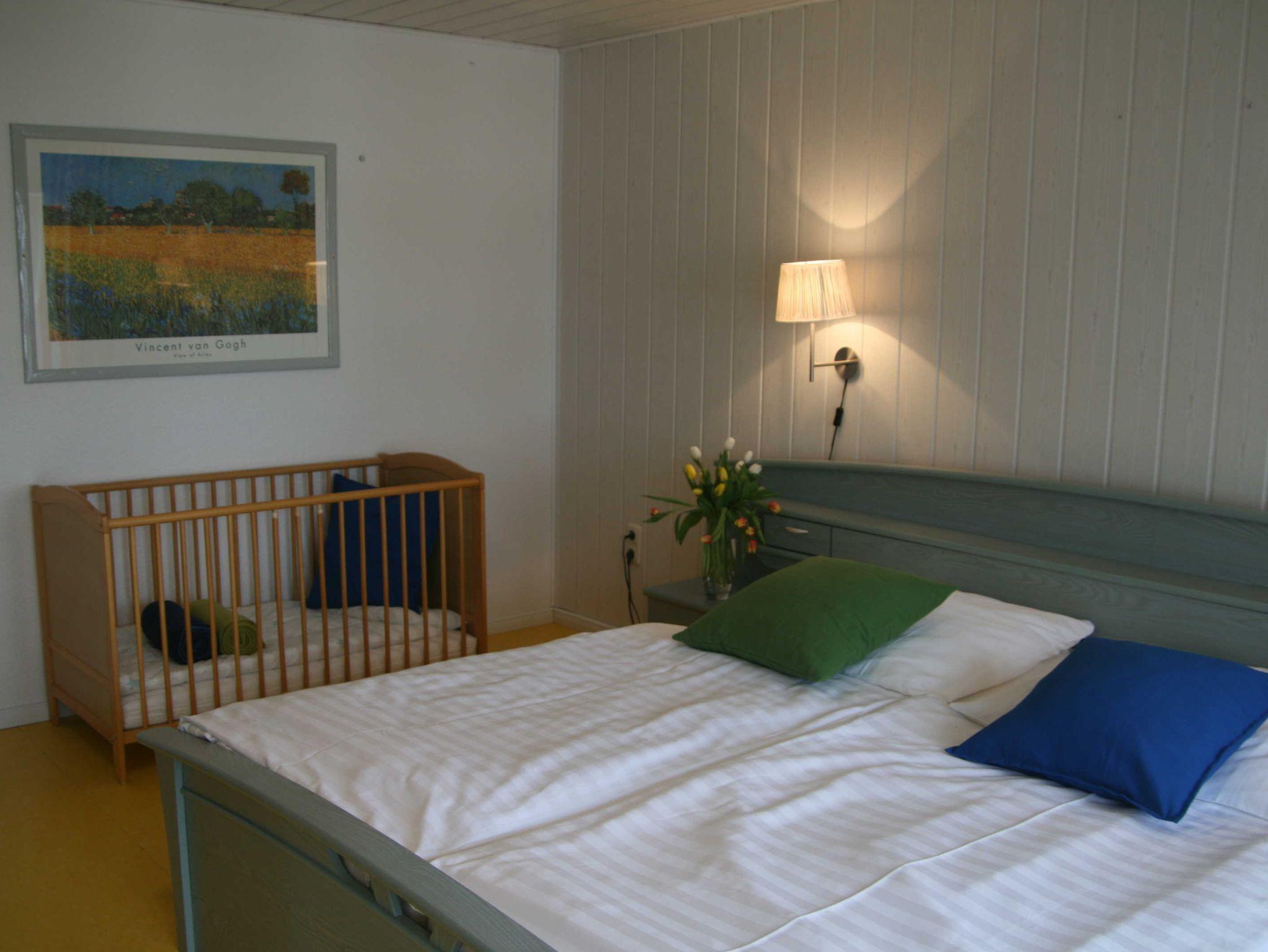 Obergeschoss: Duschbad/WC. Insgesamt 5 Schlafräume: davon 2x Doppelzimmer (Bett 1.80x2m, Babybett stellbar), 3x Kojen Zweibett-Zimmer (jeweils 2 Einzelbetten je 0.90m x 2m; ohne Kleiderschrank, Zimmerhöhe 1.90m, ideal als Kinderzimmer).