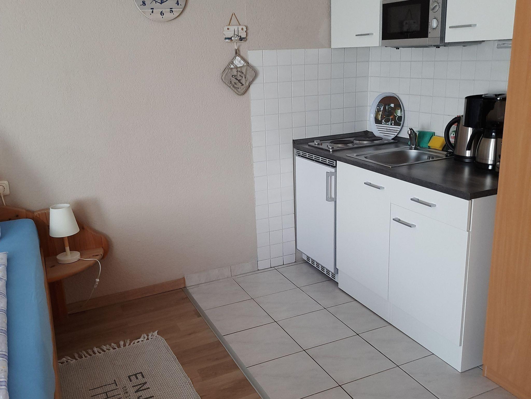 Wohn/Schlafraum mit Doppelbett (1,80x2,00m), Sat-TV, Internet-WLAN, Pantryküche mit Miniküche (2-Kochplatten, Kaffeemaschine, Wasserkocher, Toaster, Kühlschrank mit Gefrierfach, Mikrowelle), Duschbad/WC.