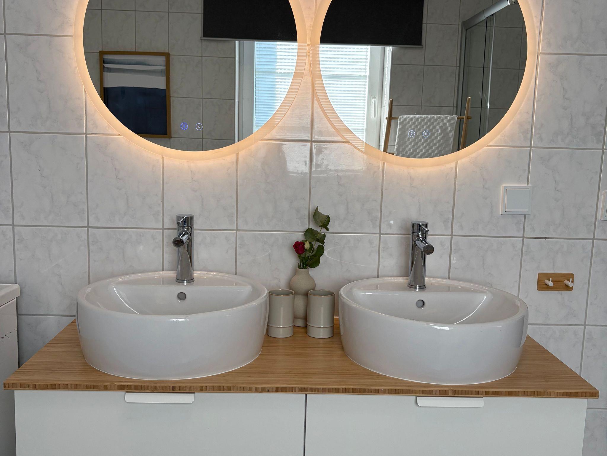 Das großzügige Bad mit Fenster zum Park ist mit zwei Waschbecken, Regendusche und Waschmaschine mit Trocknerfunktion ausgestattet.