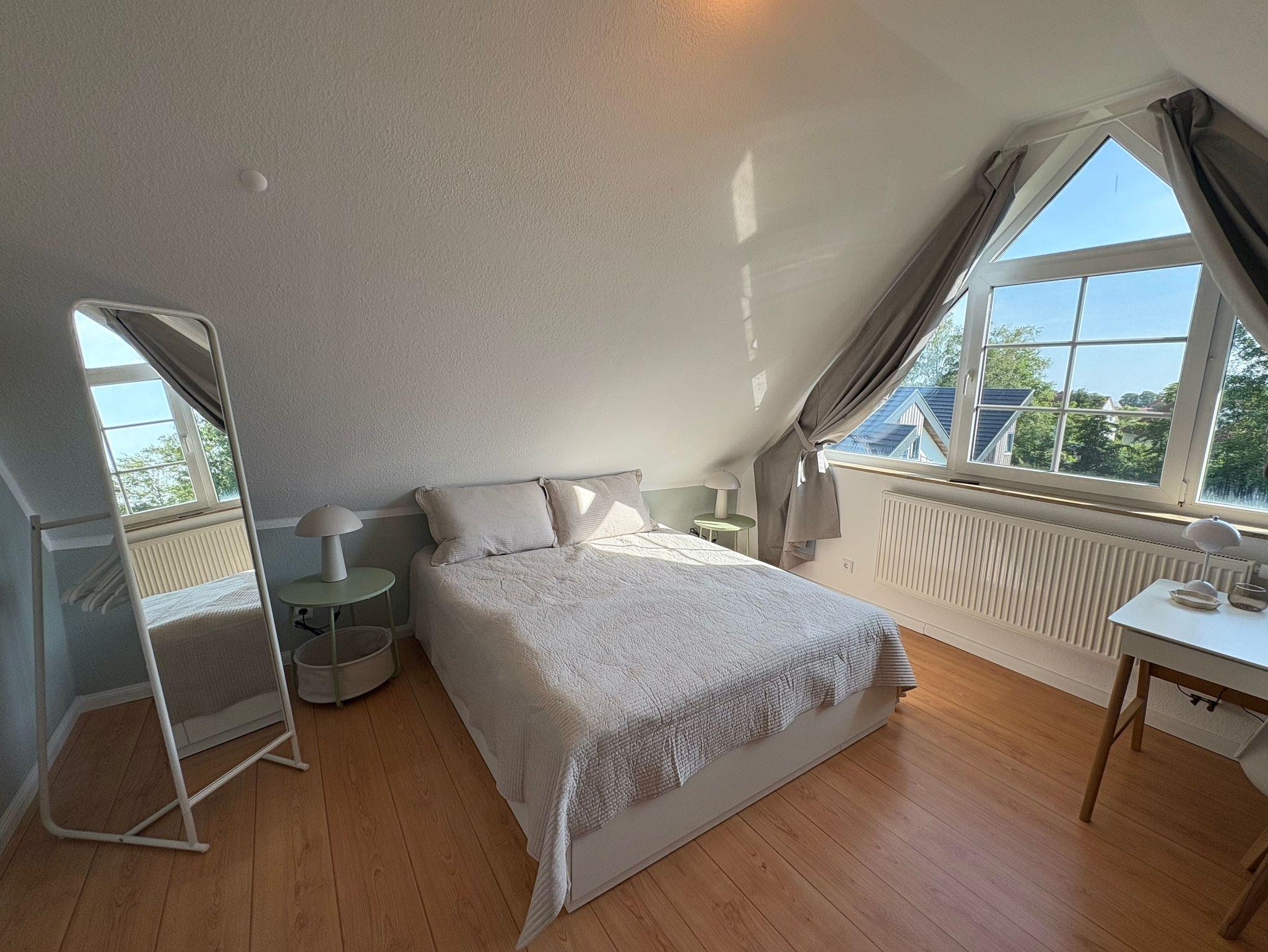 Im geräumigen, durch eine Wendeltreppe erreichbaren Giebelzimmer befindet sich ein Doppelbett (160 x 200 cm), eine gemütliche Leseecke sowie ein Schreibtisch und Smart-Bildschirm, der sich auch für Homeoffice und Workation bestens eignet.