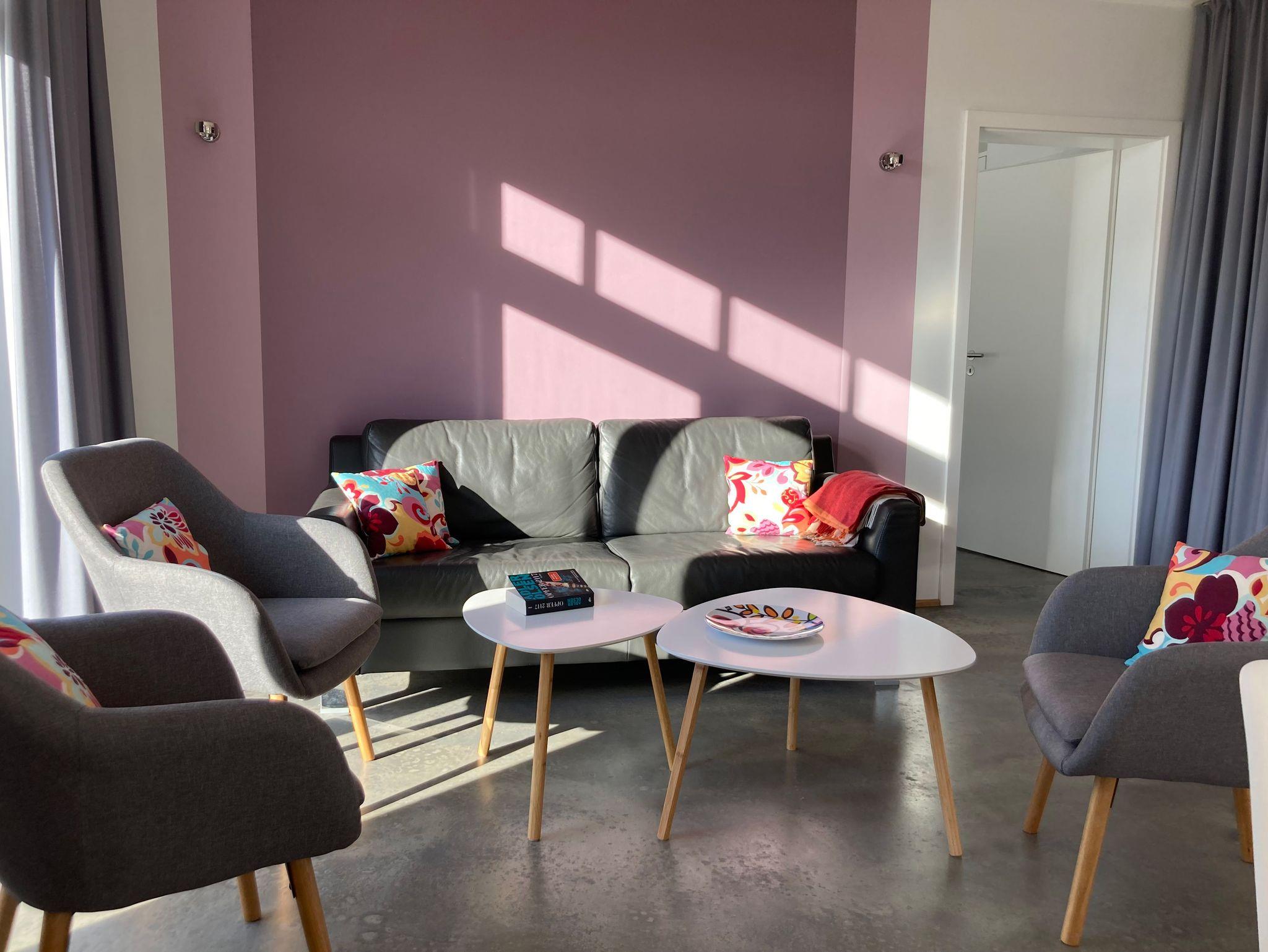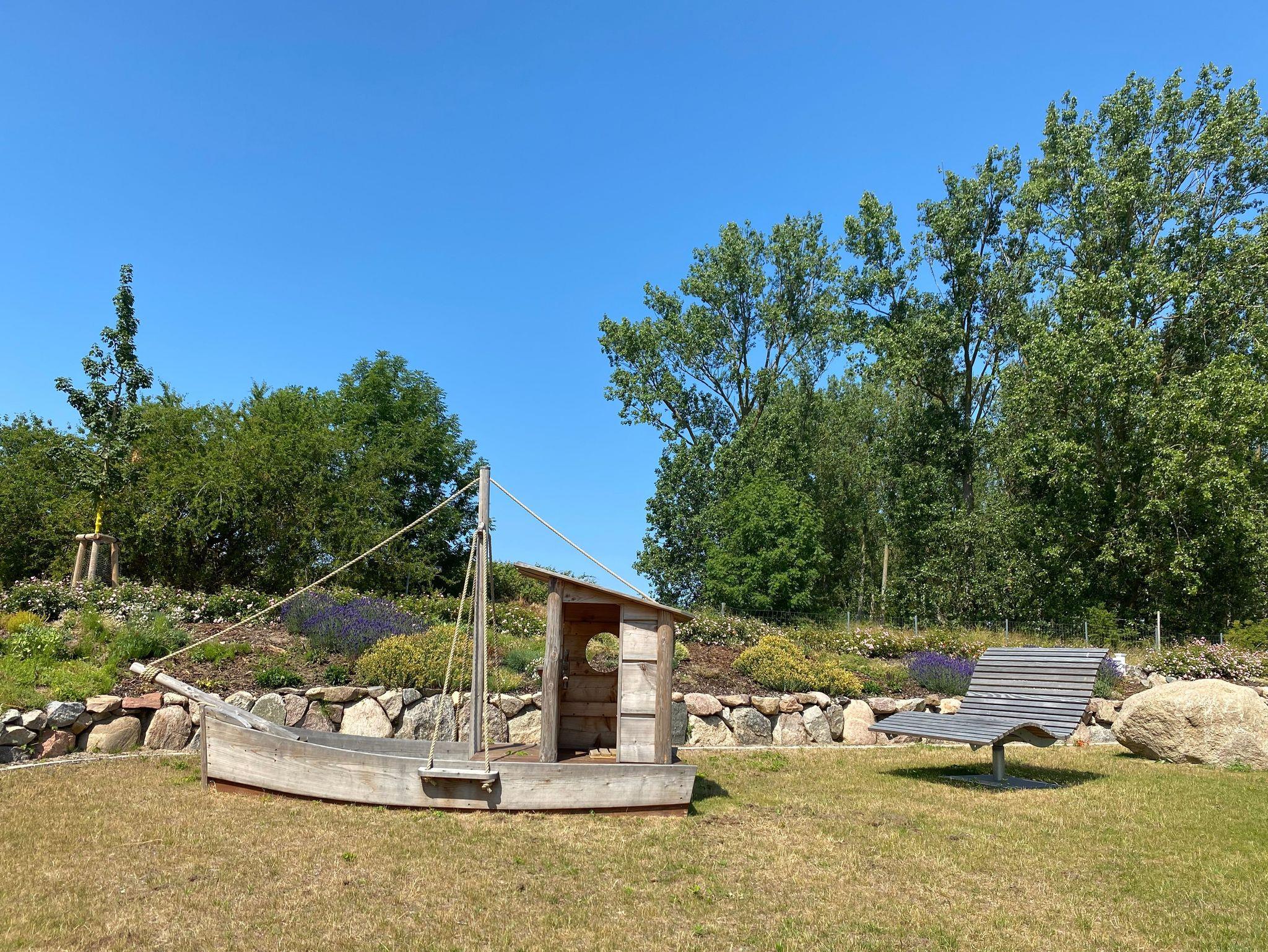 Auf zwei Etagen befinden sich drei separate Schlafzimmer mit jeweils eigenem Bad, ein zusätzliches Gäste WC im EG, einer offenen Küche im großen Wohn- Essbereich mit großem Esstisch und ausreichenden Sitzgelegenheiten, großes Schlafzimmer mit eigenem Bad und Sauna im EG, einem Aufenthaltsraum mit TV und Schlafsofa im OG, zwei weitere Schlafzimmer mit Doppelbett und eigenem Bad im OG, bei Bedarf zwei Dachbodenzimmer mit je zwei Einzelbetten (über massive Leitertreppe aus oberen Schlafräumen zugänglich), Hauswirtschaftsraum mit Waschmaschine und Trockner. Den Außenbereich bilden 2 Terrassen inkl. Sitzausstattung und Grill, 1 Bouleplatz, Himmelsliegen und ein Spielschiff im großen, von einem Friesenwall gefassten Garten.