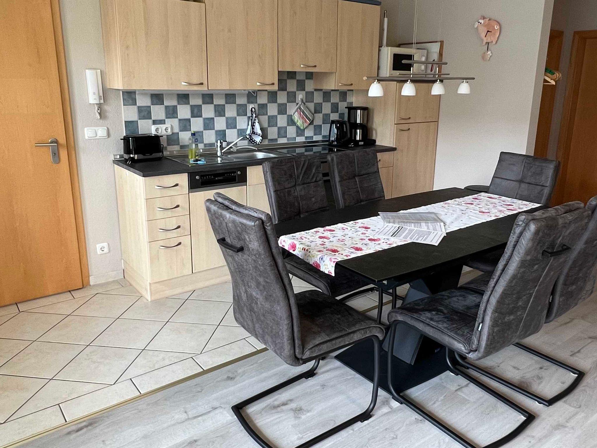 Der angegliederte Essbereich besteht aus einem großen Esstisch mit ausreichend bequemen Stühlen.