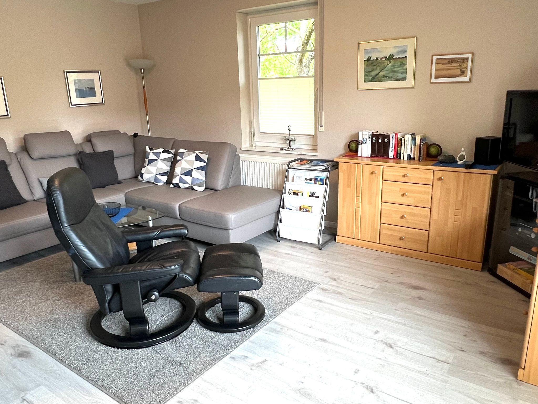 Sie verfügt über einen hellen, lichtdurchfluteten Wohnraum mit Couchecke, Fernsehsessel,Sat- TV und WLAN.
