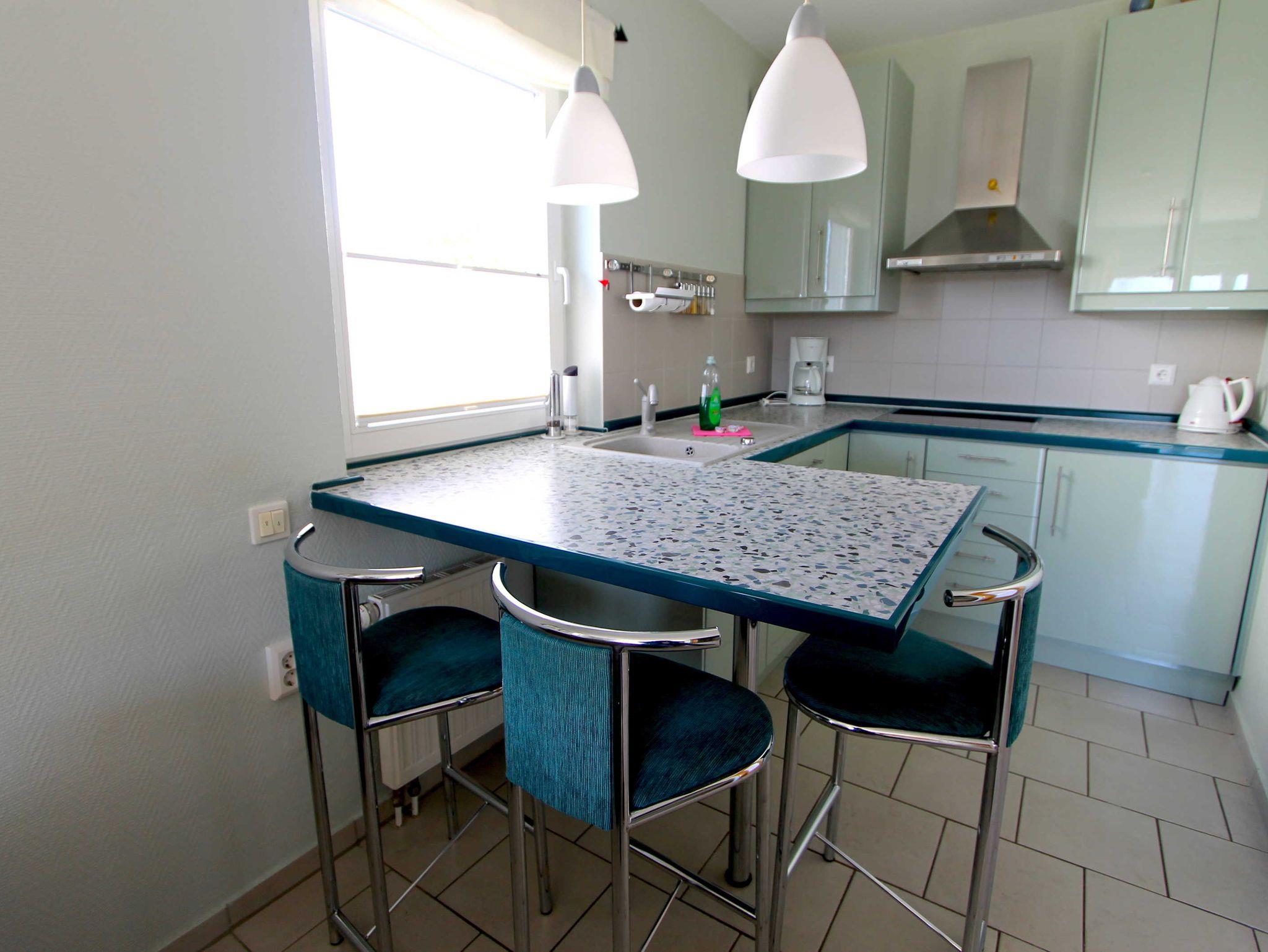 Darin integriert ist der Essbereich mit Esstresen und Stühlen sowie die komplett ausgestattete Küchenzeile mit Herd, Kühlschrank mit Gefrierfach sowie Geschirrspüler und vielem mehr.