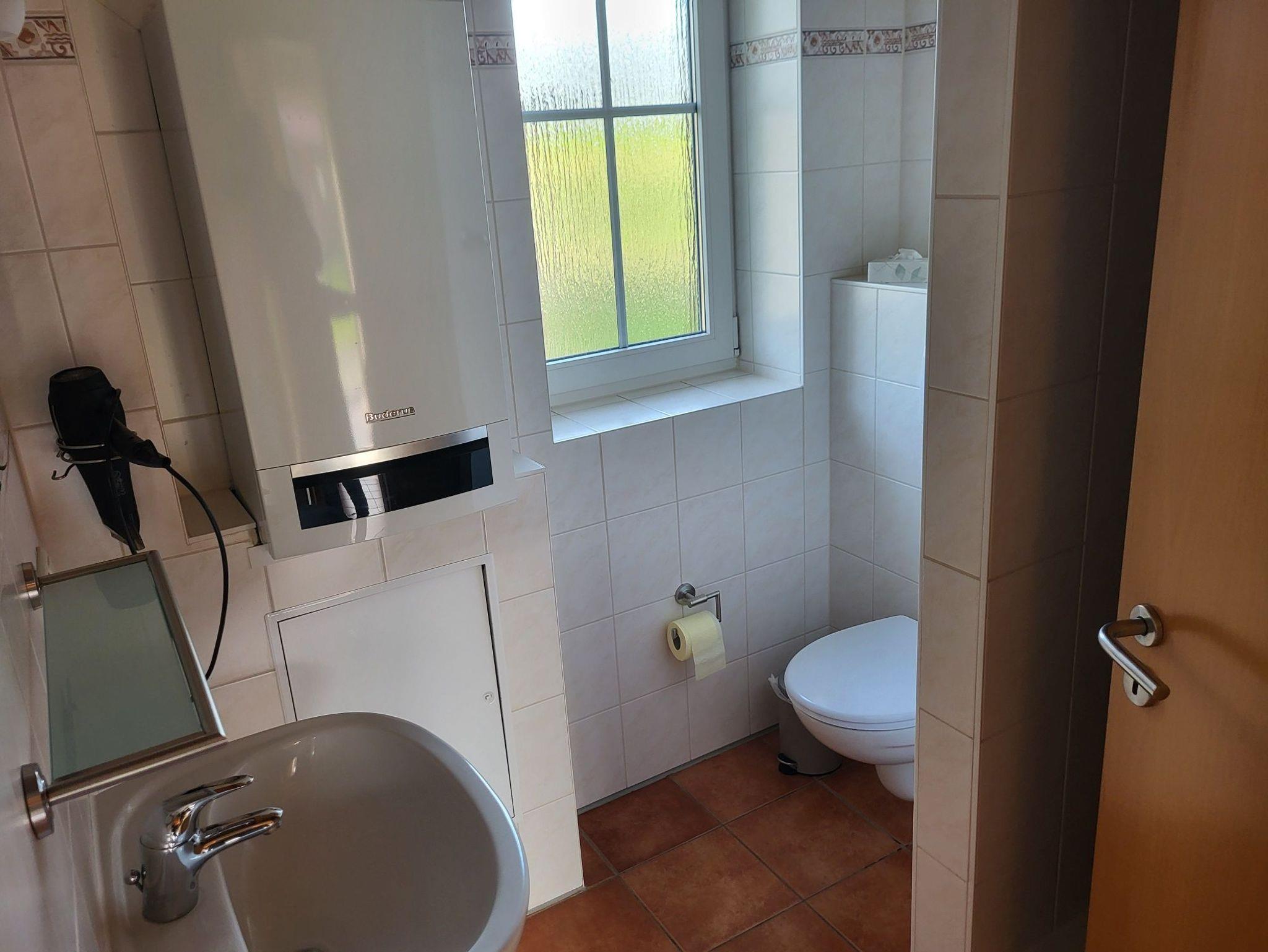 Im Obergeschoss unter den Dachschrägen befinden sich zwei weitere Schlafzimmer. Schlafzimmer 2 ist mit 2 Einzelbetten (je 0,90 m) ausgestattet, die wahlweise zusammen oder getrennt gestellt werden können. In Schlafzimmer 3 stehen 2 Einzelbetten (je 0,80 m) zur Verfügung. Zudem gibt es ein Gäste-WC mit Waschbecken.