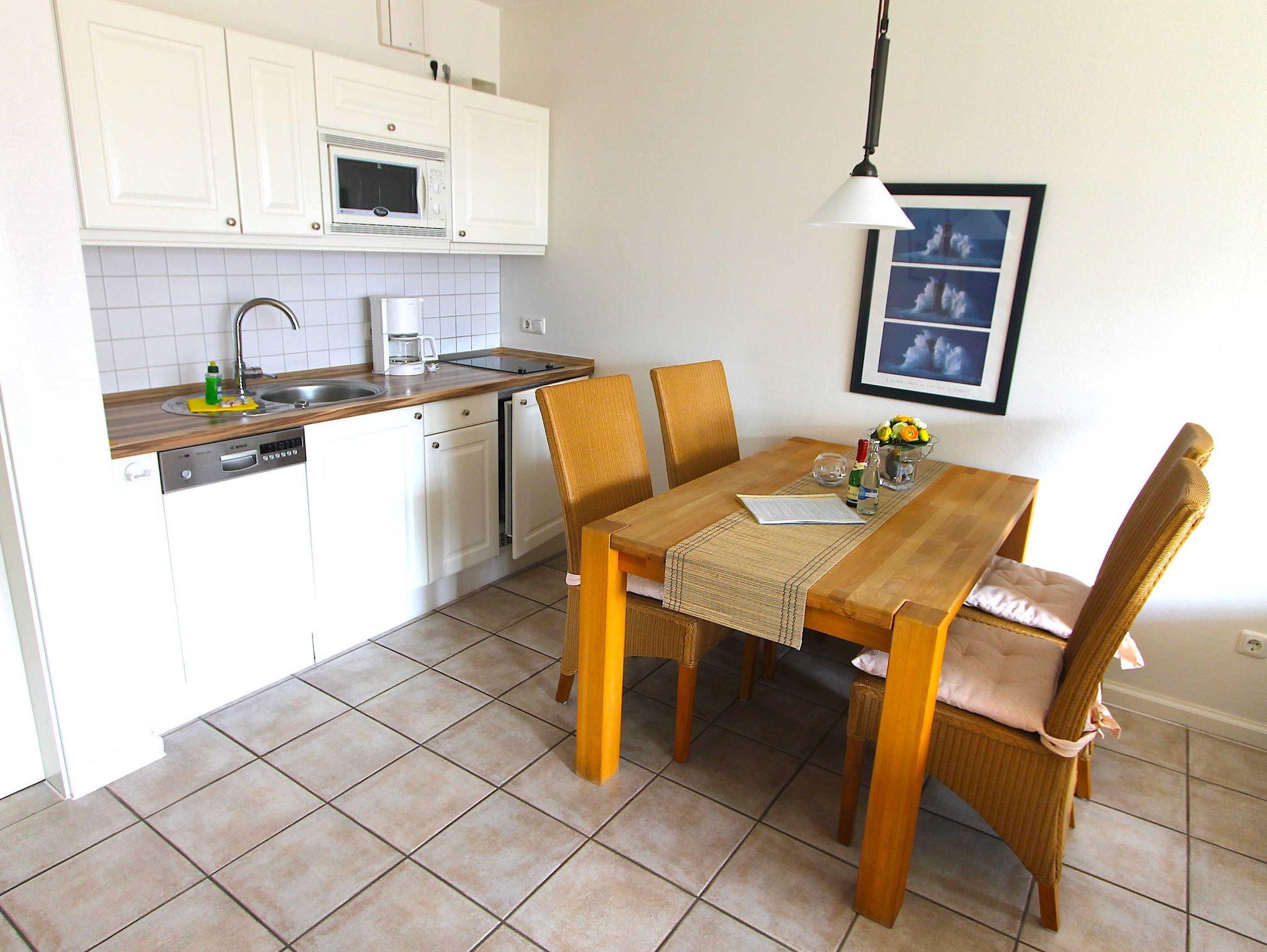 Die integrierte Küchenzeile verfügt über ein 2- Plattencerankochfeld, Mikrowelle, Kühl-/Gefrierkombination, Kaffeemaschine, Toaster sowie Geschirr, Töpfe und alles was man braucht. Ebenso ein Esstisch mit 4 Stühlen.
