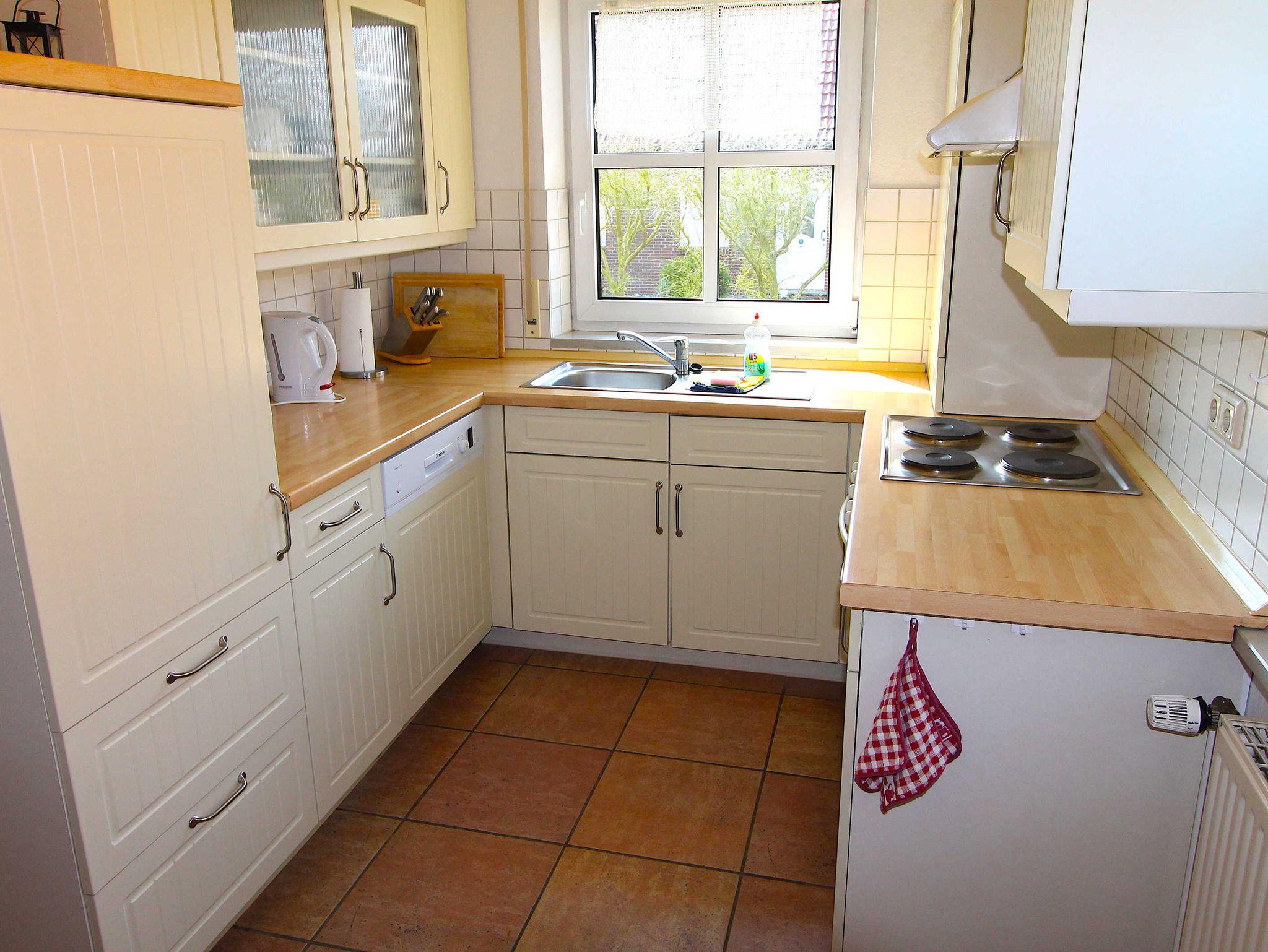 - Küche mit Essecke, Herd, Kühlschrank mit Gefrierfach, Geschirrspüler