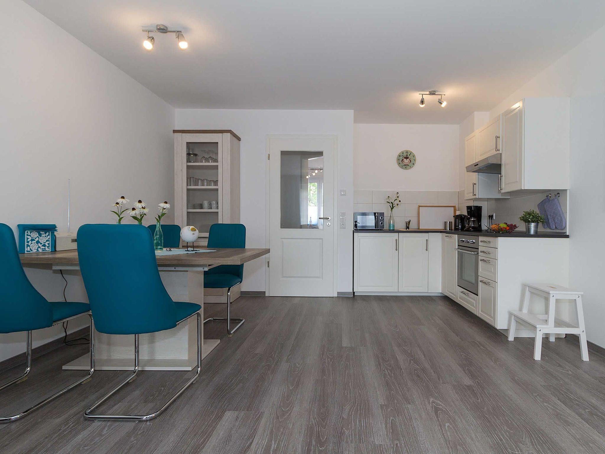 Die offene voll ausgestattete Küche verfügt neben ausreichend Geschirr, 4-Platten-Cerankochfeld, Backofen und Mikrowelle, auch über einen Geschirrspüler, Wasserkocher, Toaster, Kaffeemaschine. Eine Sitzgruppe bietet allen Gästen einen bequemen Platz zum gemeinsamen Speisen.