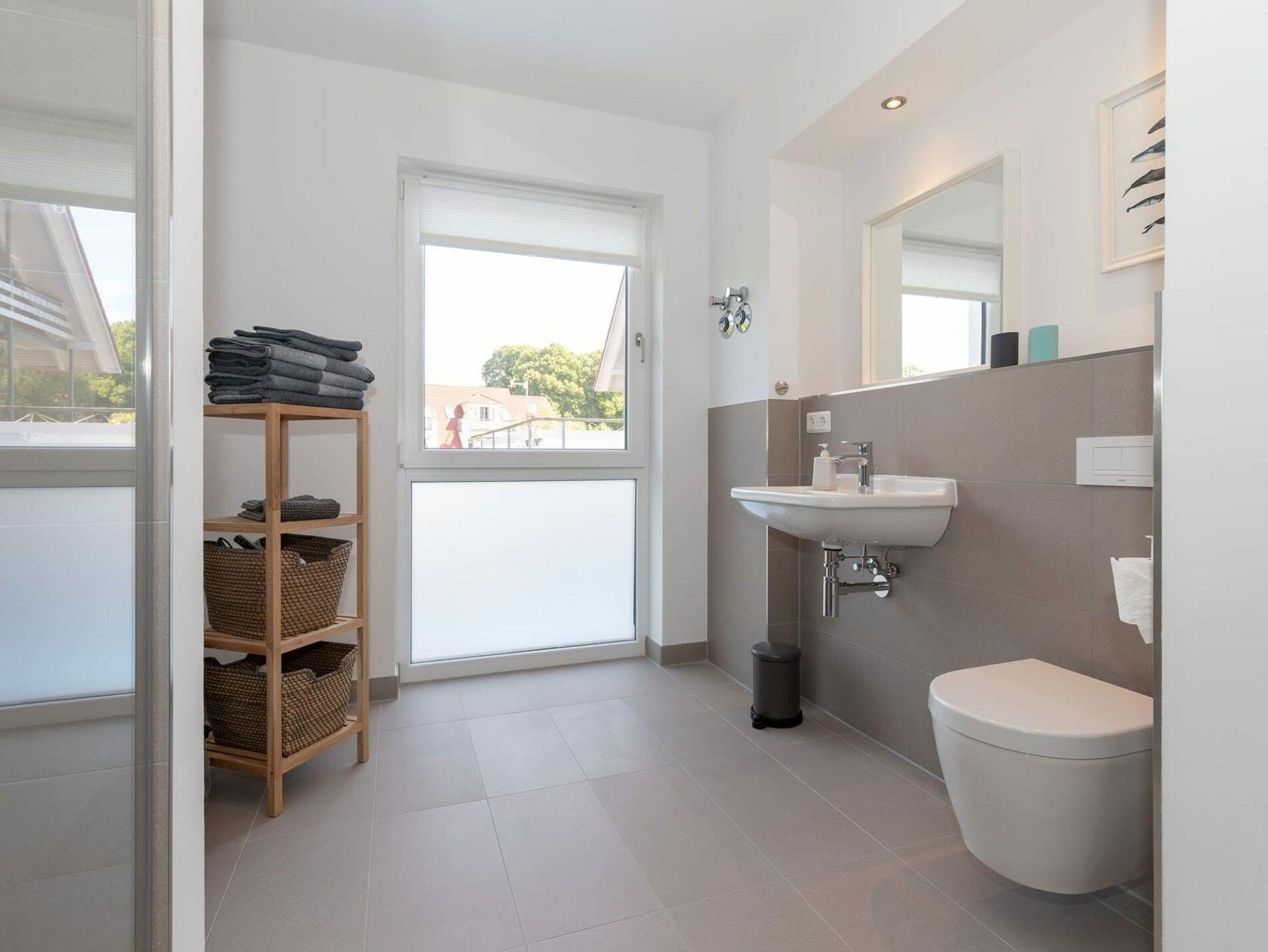 In dem modernen Bad mit ebenerdiger Dusche und WC können Sie kostenlos die neue Waschmaschine nutzen.