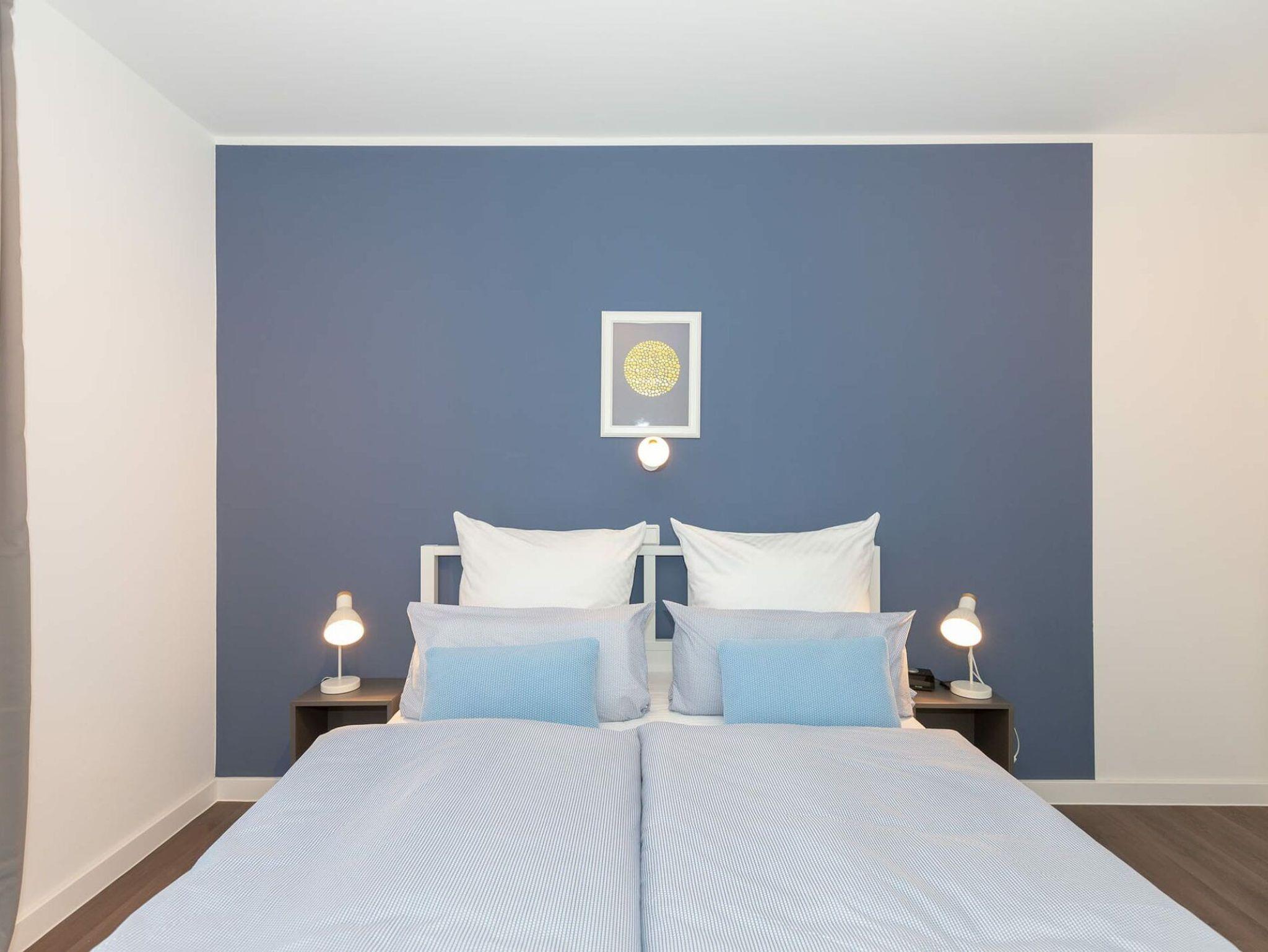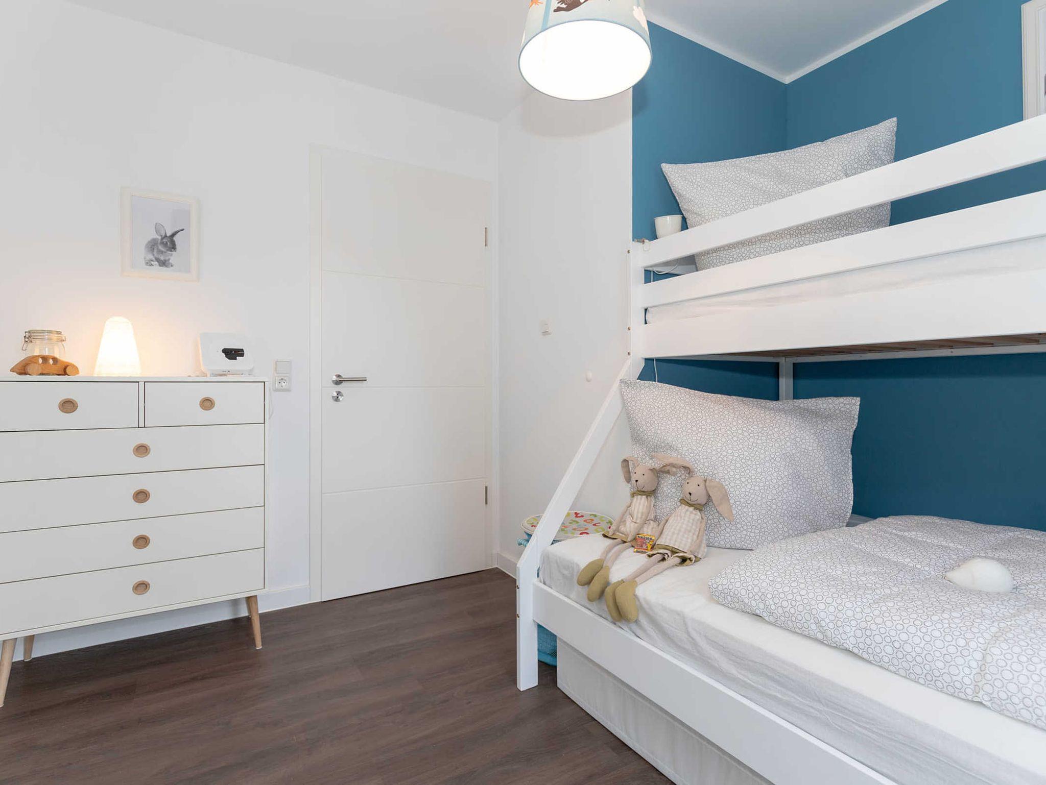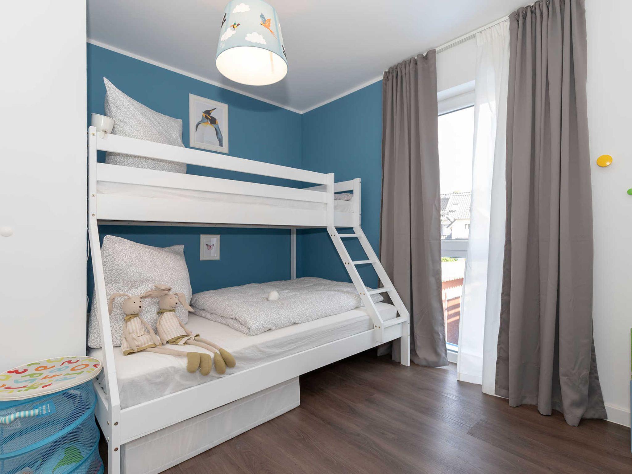 Die Wohnung verfügt über 2 Schlafzimmer. Im ersten Schlafzimmer ist ein Doppelbett (1,80m x 2,00m) und im zweiten Schlafzimmer ist ein Etagenbett (untere Liegefläche 1,40 m x 2,00 m und die obere Liegefläche beträgt 90 x 2,00 m).