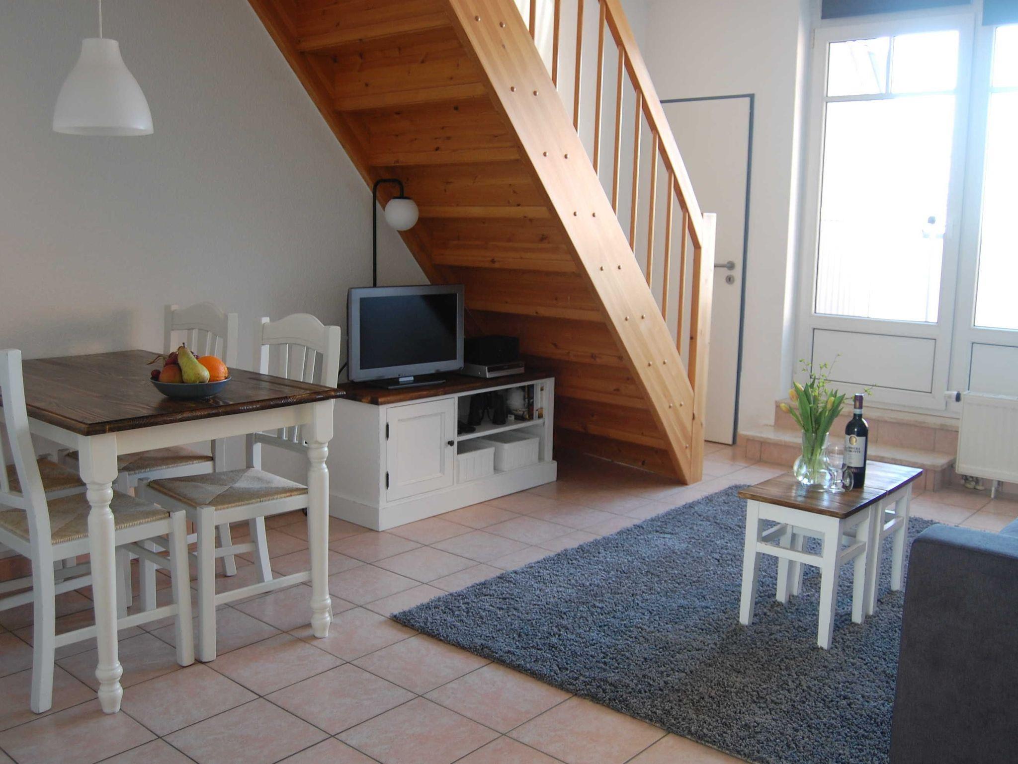 Die Ferienwohnung über 2 Ebenen in Rerik bietet Ihnen eine Loggia mit Blick auf die Ostsee und das vor der Haustür beginnende Salzhaff. Das separate Schlafzimmer hat ein Doppelbett und eine Ausziehcouch im offenen Wohnbereich. Die Küche ist gut ausgestattet.