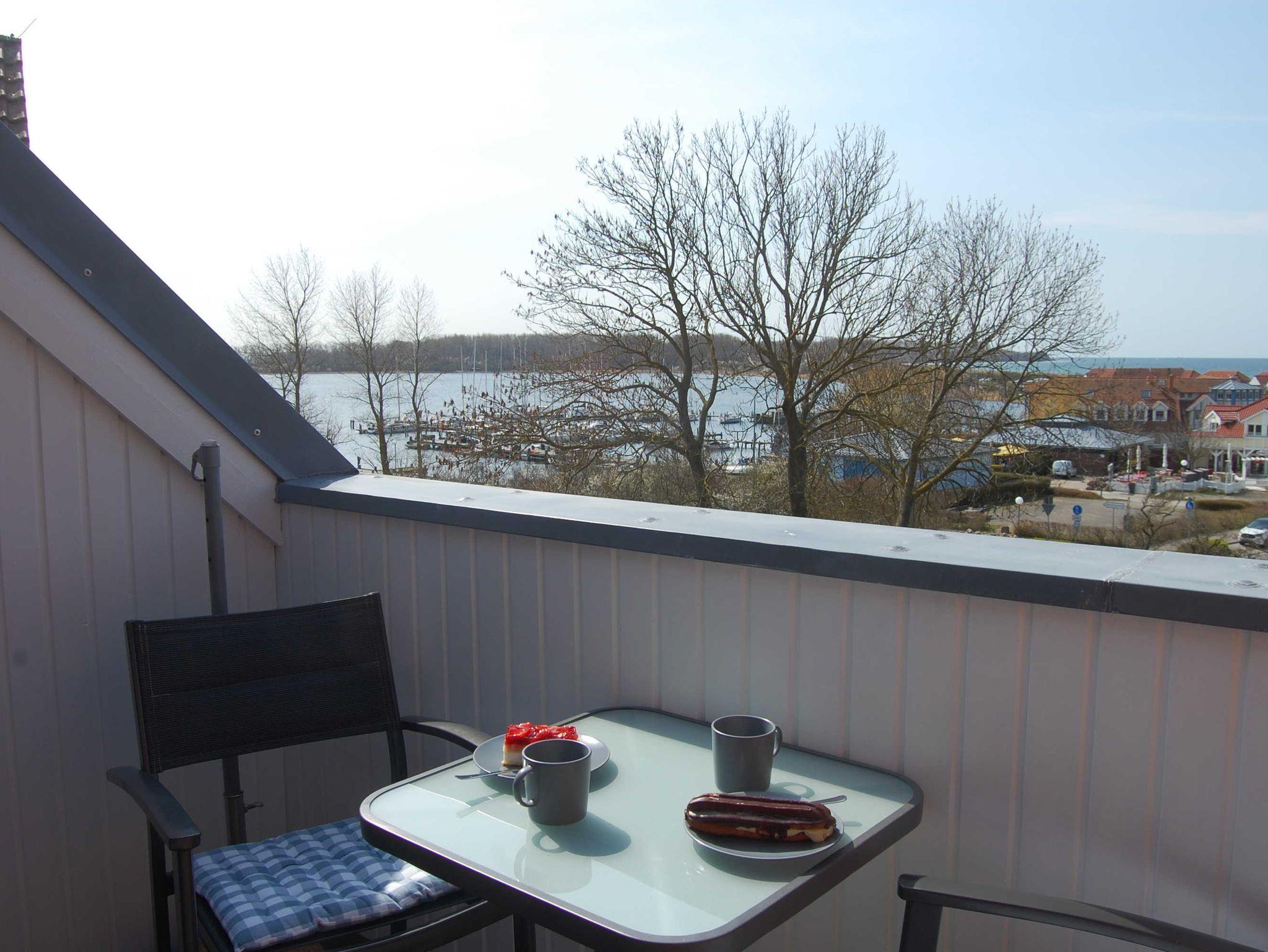 Von der nach Westen ausgerichteten Loggia genießen Sie Nachmittags- und Abendsonne mit Haff- und Meerblick.