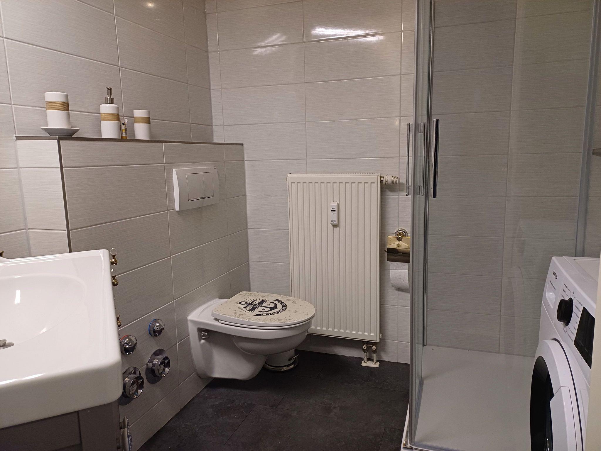 Innenliegendes Bad mit begehbarer Dusche, WC und Waschmaschine