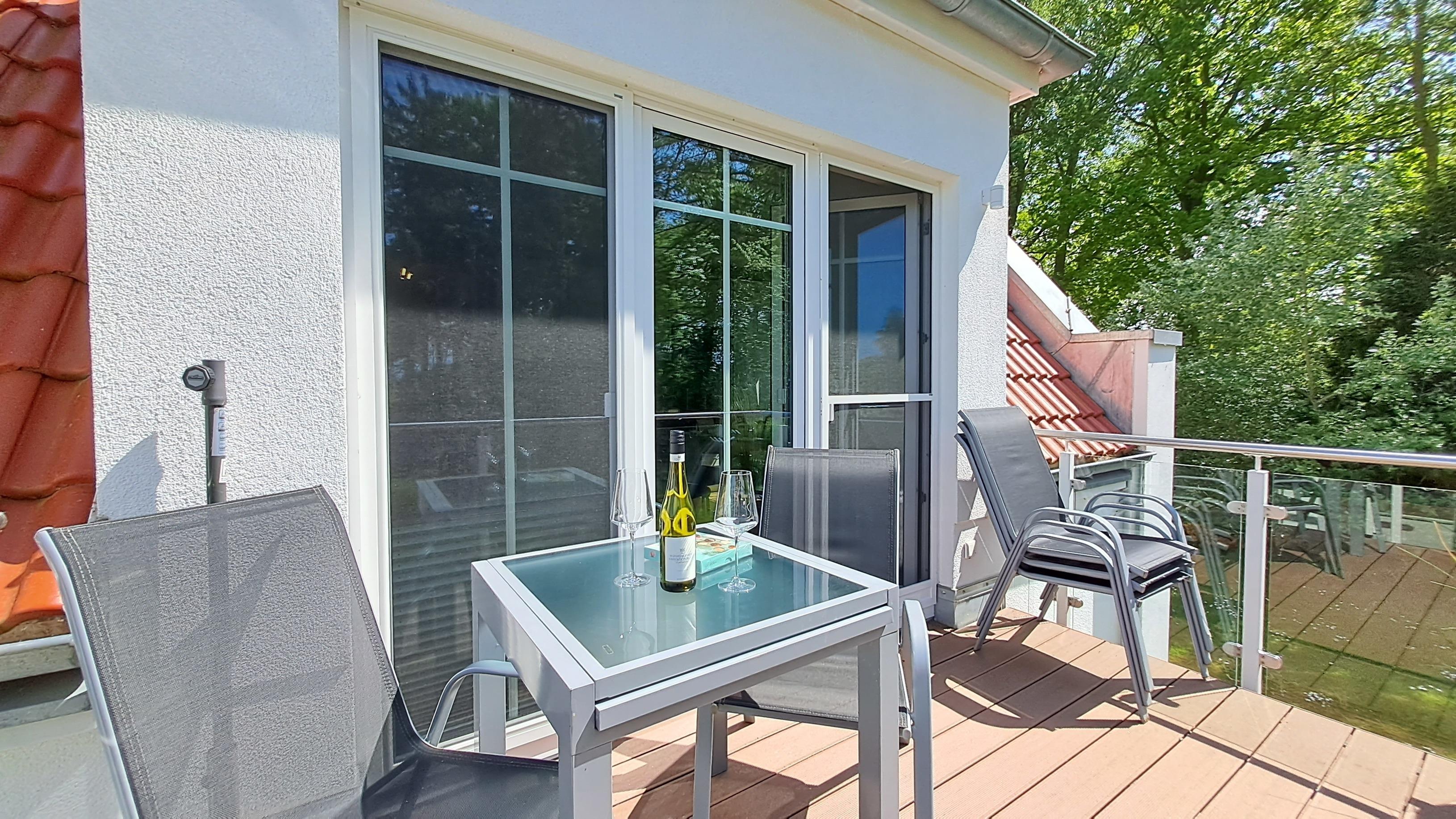 Der Wohn- und Essbereich mit offener Küche bildet den Mittelpunkt des gemeinsamen Ostseeurlaubs. Ein gemütliches (Schlaf-)Sofa, Curved-TV, Blue-Ray, DVD-Player und WLAN gehören zur Ausstattung. Vom Wohnbereich aus gelangen Sie auf den möblierten BALKON. Von hier aus haben Sie einen, je nach Belaubung der Bäume, kleinen Meerblick.