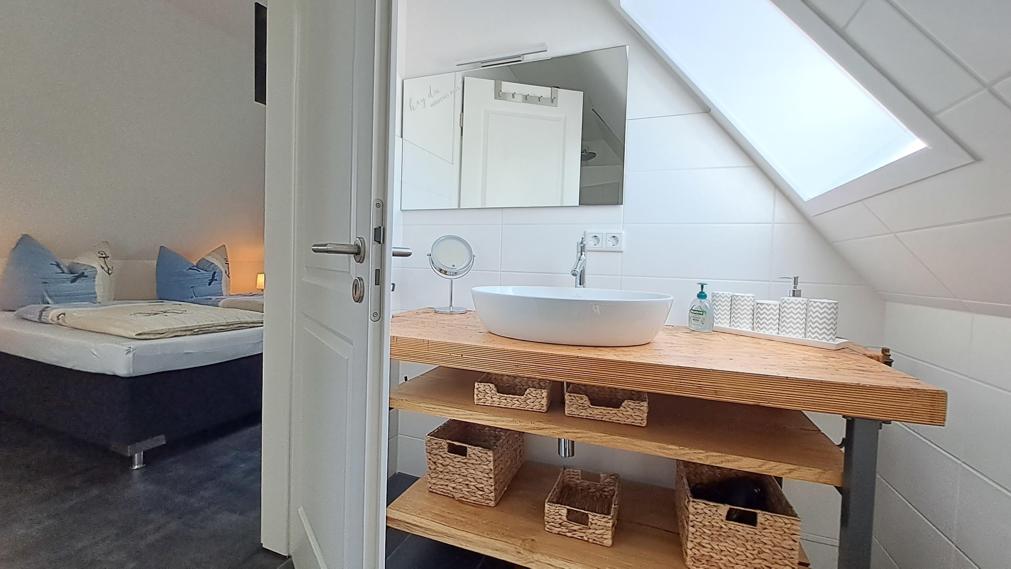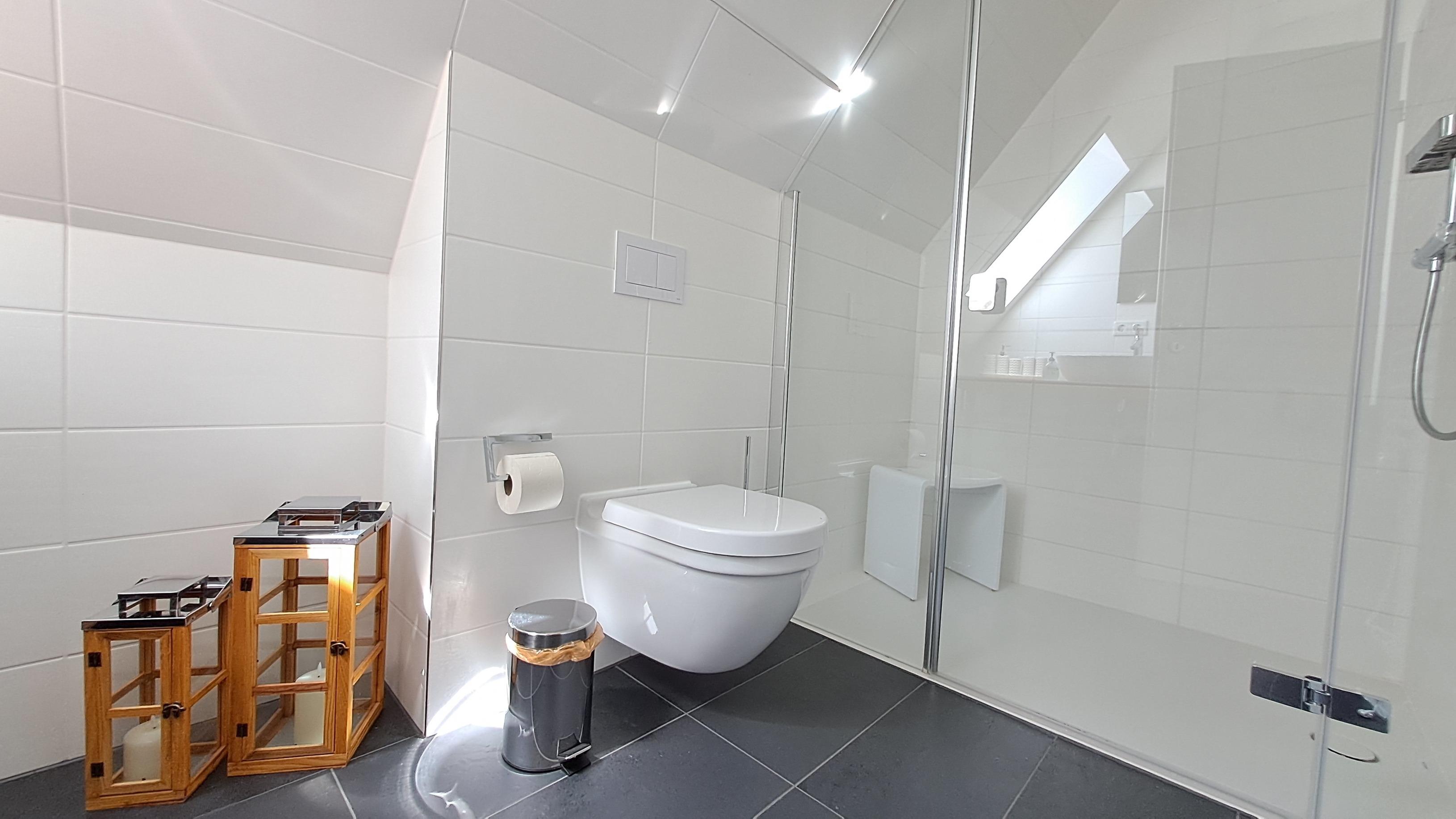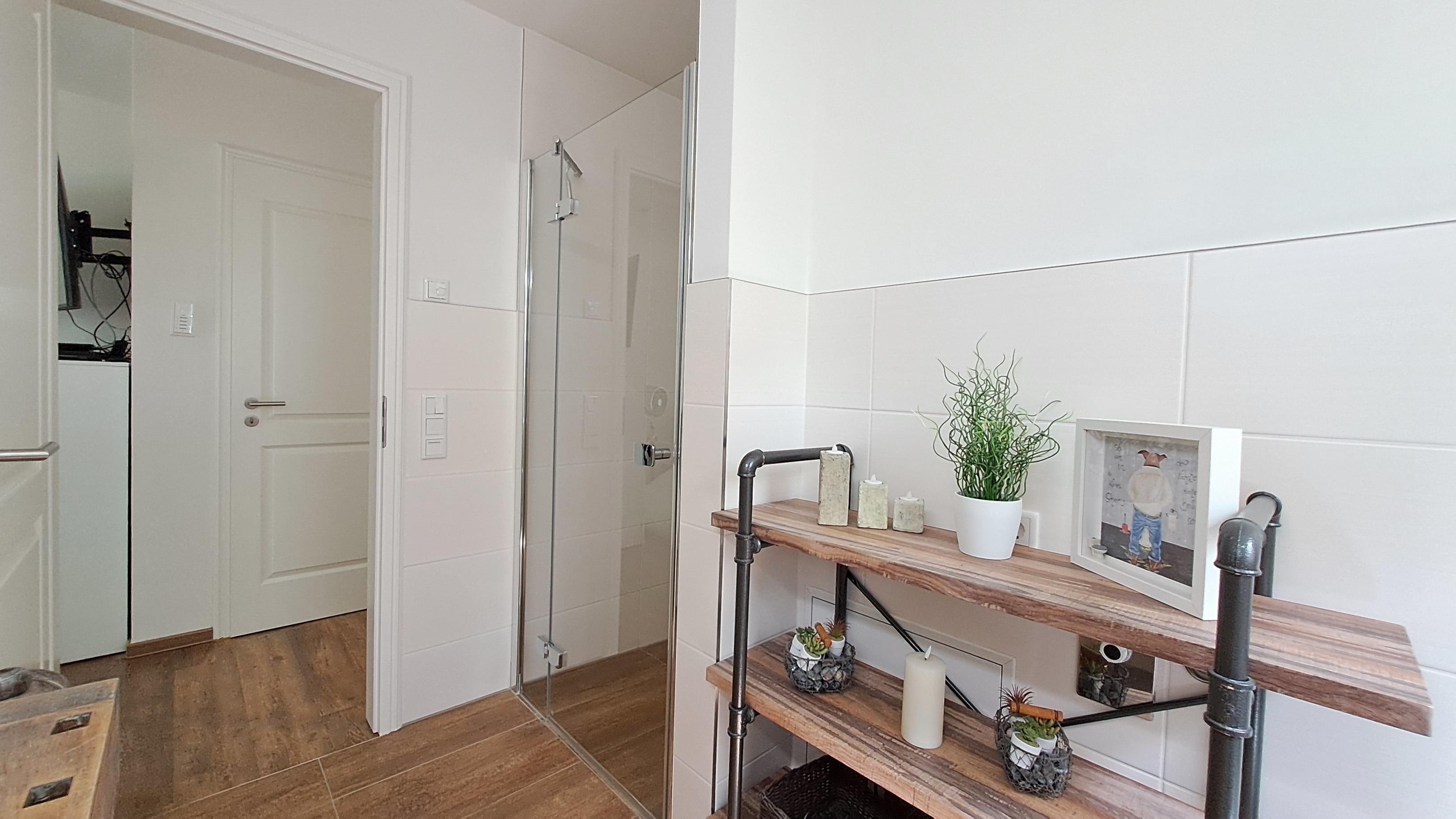 - Nr. II im DG angrenzend an das Schlafzimmer; mit ebenerdiger Dusche, Waschtisch, WC und Föhn