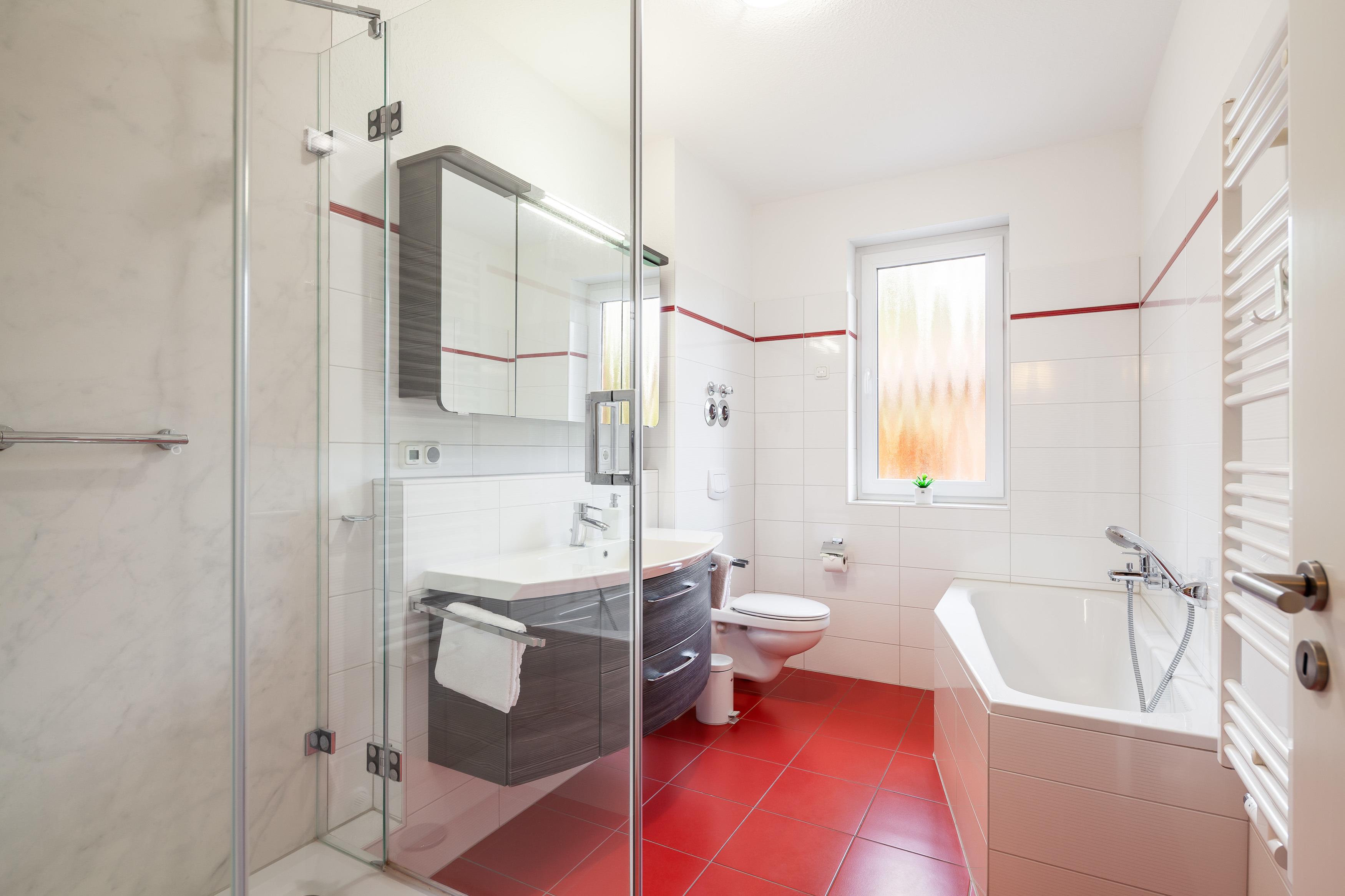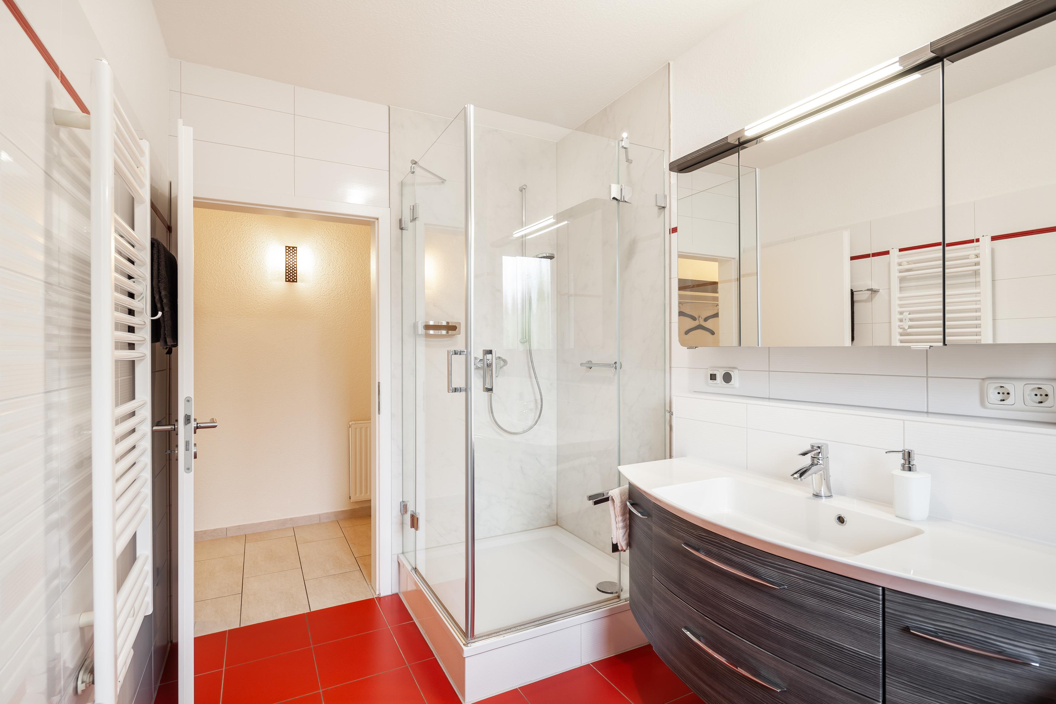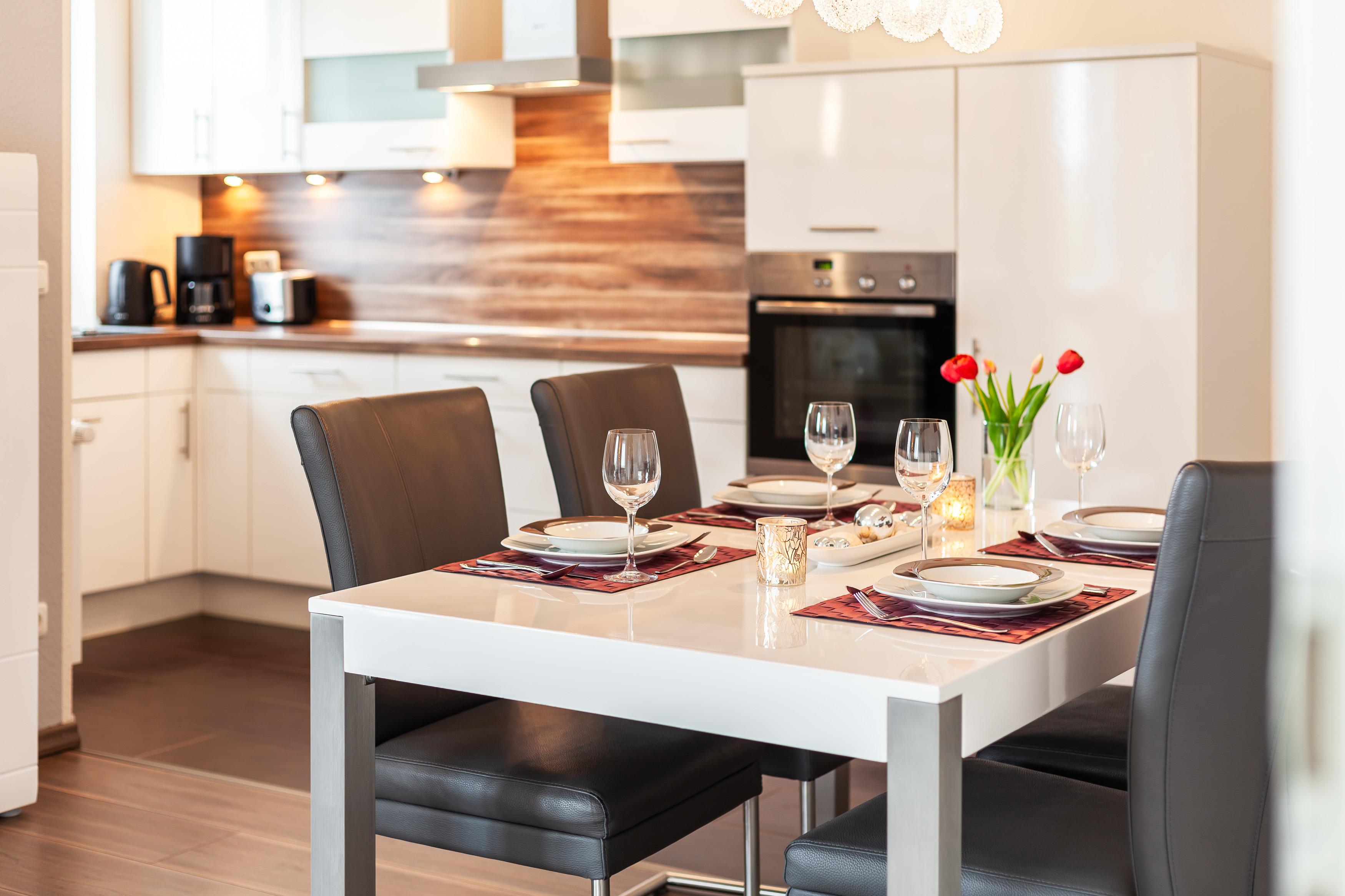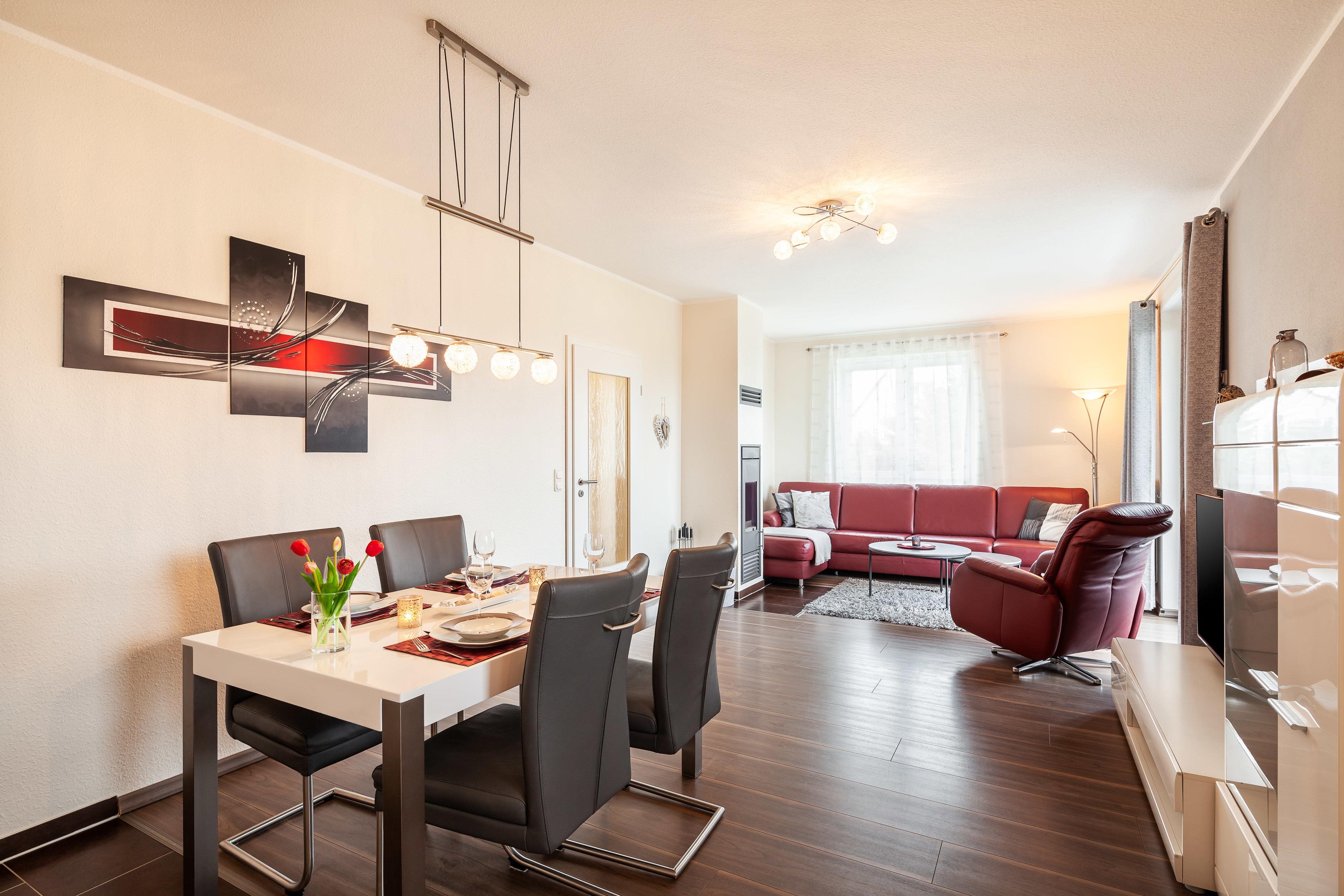 Die Fewo 'Gorch Fock' , 71qm, mit einer großen Terrasse liegt im Erdgeschoss und verfügt über zwei Schlafzimmer. Die offene Küche, in weiß/Lack mit einer Holzoptikarbeitsfläche, ist mit allem Komfort wie Geschirrspüler, Kühlschrank mit Gefrierfach, Mikrowelle, Cerankochfeld, erhöhter Backofen, Granitspüle, Kaffeemaschine, Gewürzen usw. ausgestattet. Der weißgelackte Esstisch mit den bequemen Schwingstühlen bietet Platz für 6 Personen. Der gemütliche Wohnraum mit Kamin ist mit einer dunkelroten Leder-Komfortsitzecke und einem behaglichen Fernsehsessel ausgestattet. Ein großer 50 Zoll-Smart TV, Blu-Ray-Player, sowie Spiele, Bücher und Umgebungskarten sind vorhanden. Das helle, schöne Badezimmer mit Tageslichtfenster ist in rot/weiß gehalten, mit einem anthrazitfarbenen Waschtisch, 1m x 1m Dusche und Badewanne, Fußbodenheizung und Radio ausgestattet. Der geräumige Flur und ein separater Abstellraum bieten viel Platz. Die Wohnung hat ein Schlafzimmer mit einem Doppelbett (180 x 200 cm) und einem weiteren 41 Zoll Smart TV. Das weitere Schlafzimmer nebenan besteht aus 2 Einzelbetten jeweils mit einer Liegefläche von 90 x 200 cm. An allen Fenstern und Türen befinden sich elektrische Rollläden.