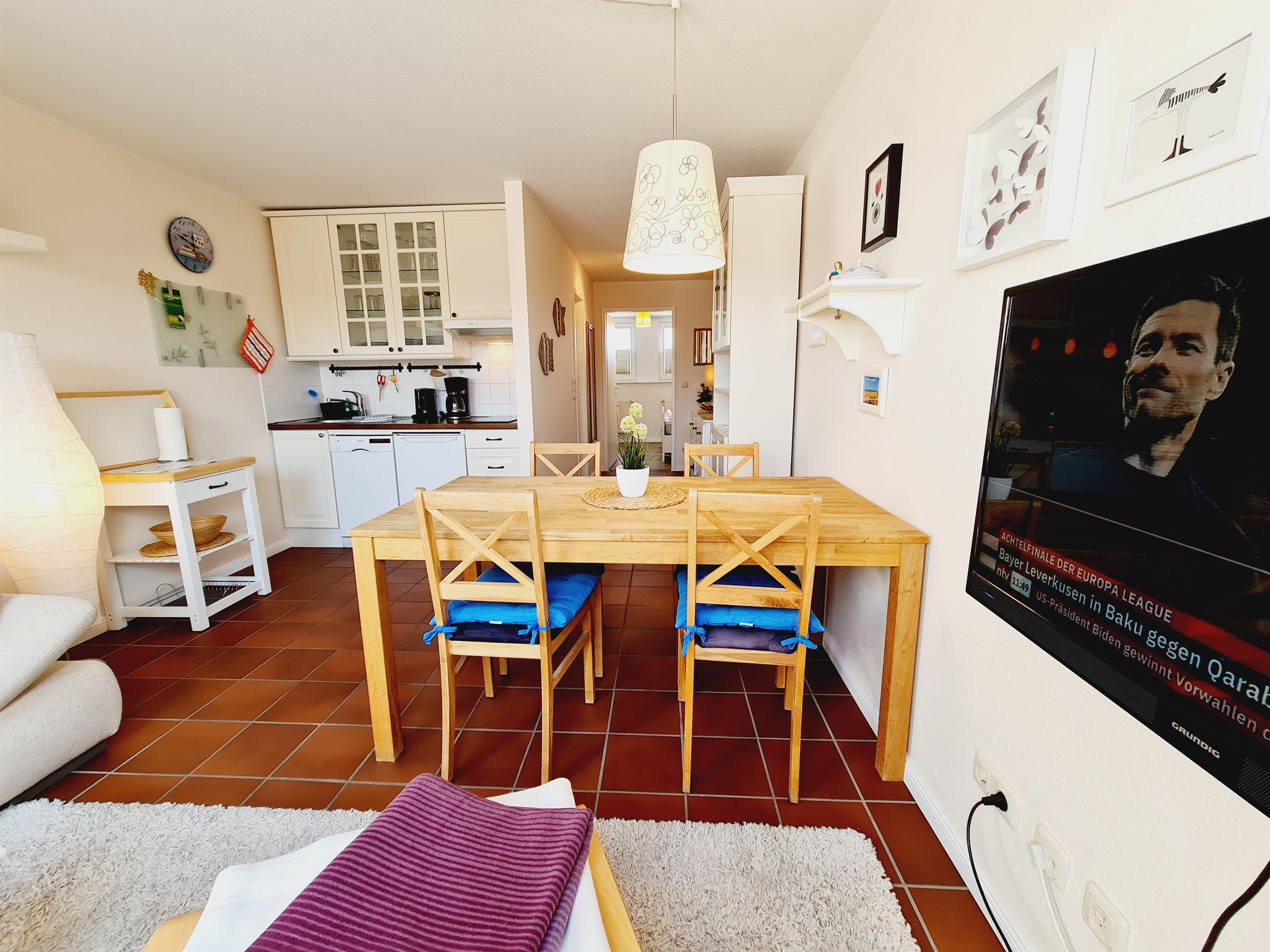 1 Offene, helle Wohnküche mit Esstisch, gemütlicher Sofaecke und TV