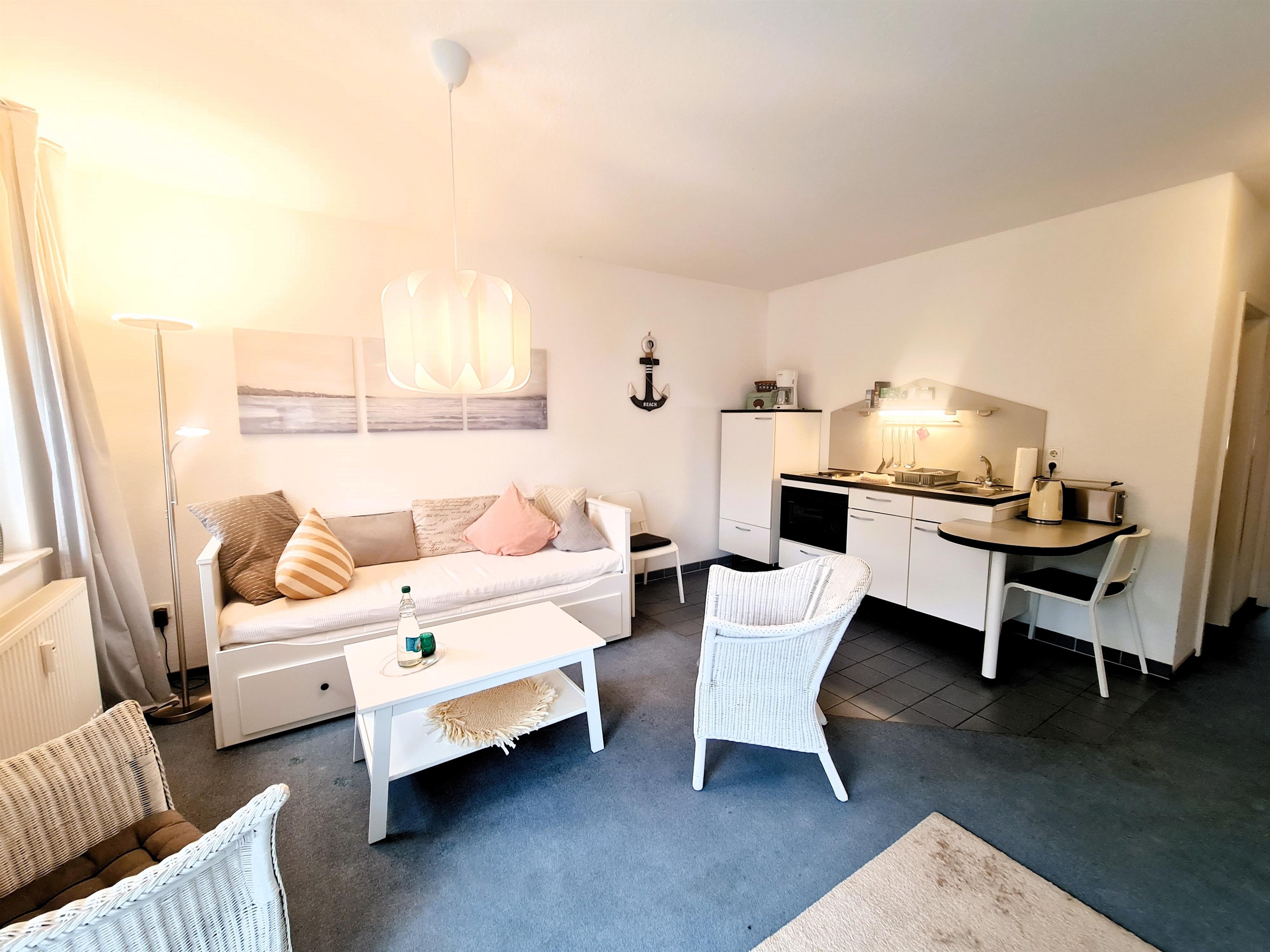 Diese schöne Ferienwohnung bietet auf ca. 45m² einen offenen Wohn- und Essbereich für 2 Personen.