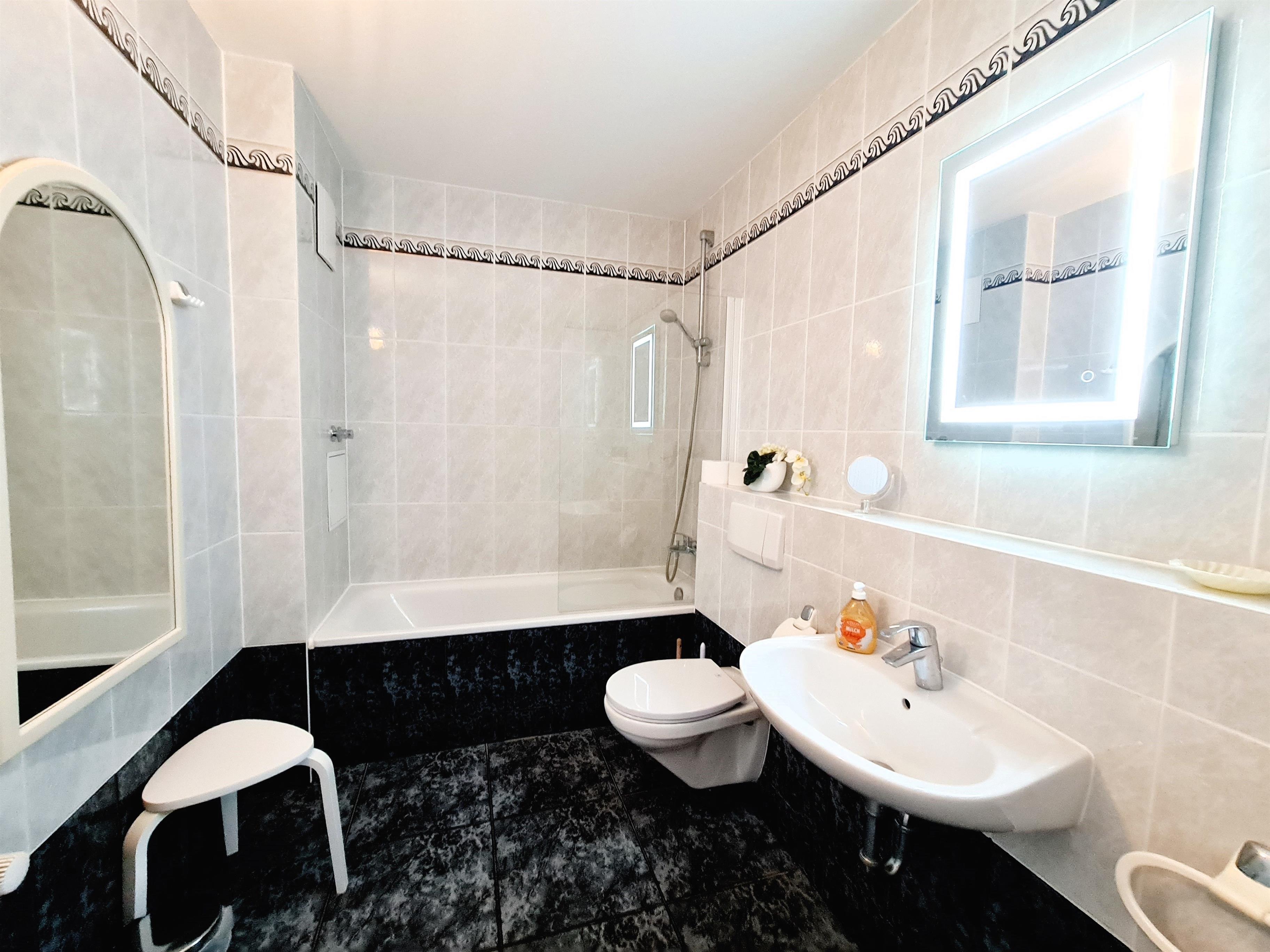 Das Badezimmer ist hell und mit einem WC, Waschbecken, Badewannendusche ausgestattet.