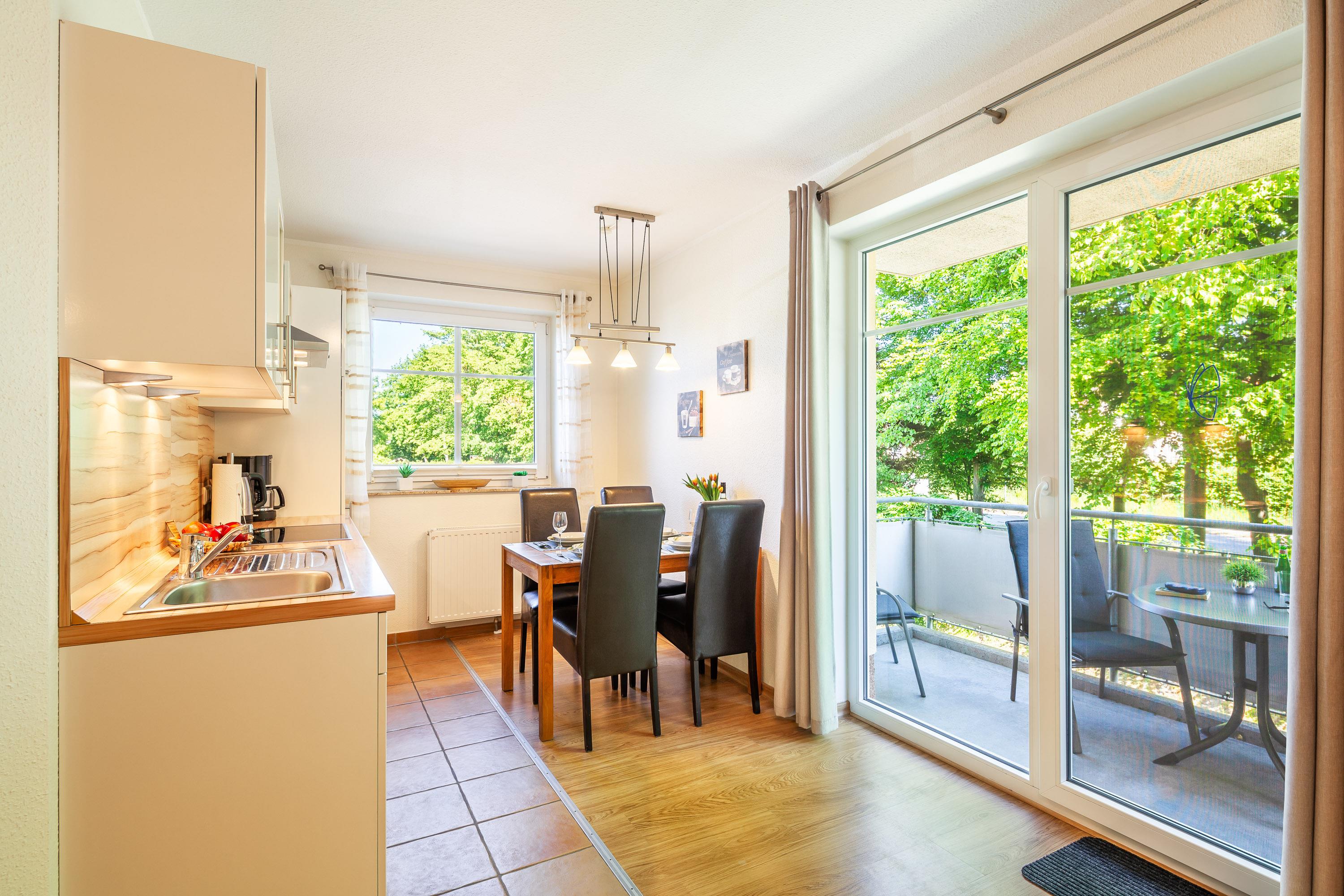 Die hochwertige Küche ist mit allem Komfort ausgestattet. Genießen Sie ein schönes Frühstück auf unserem möblierten Balkon oder am gemütlichen Esstisch. Im Bad befinden sich ein Waschtisch mit großem Spiegelschrank, eine Dusche und Fußbodenheizung. Alle Fenster sind mit hochwertigen Insektenschutzgittern ausgestattet. Zur Ferienwohnung Feelmeer gehört ein KFZ-Stellplatz vorm Haus. Ihre Fahrräder können Sie im eigenen Fahrradraum einstellen.