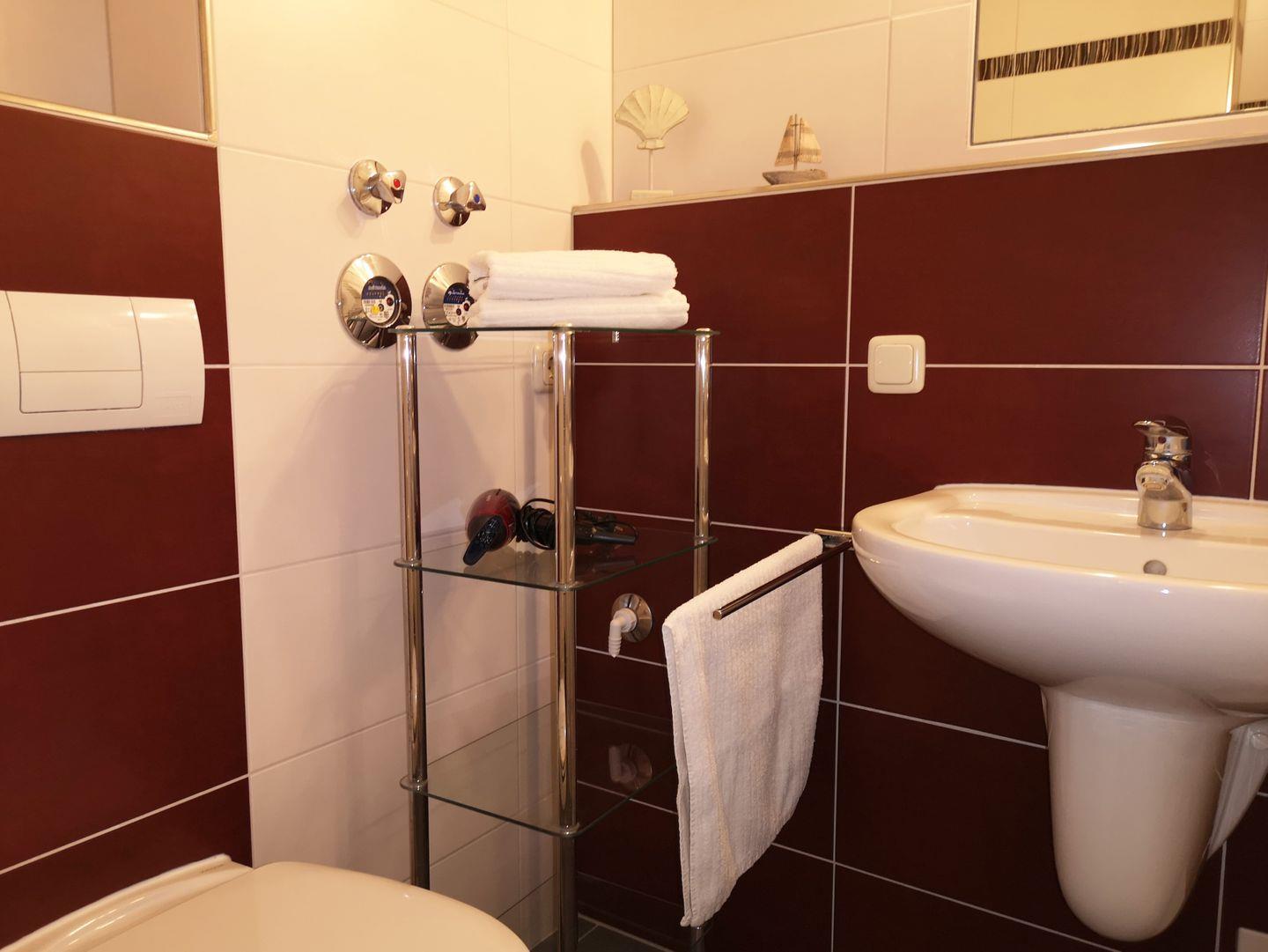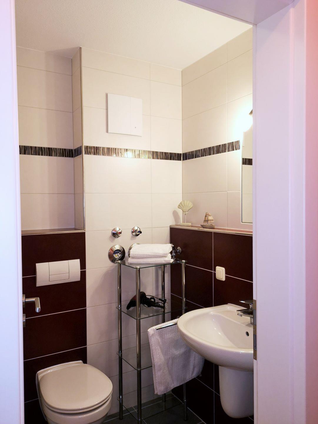 Das große und moderne Badezimmer verfügt über einen sehr großen Duschbereich (160 cm x 90 cm) mit ebenerdigem Einstieg (seniorenfreundlich!) und einer thermostatgeregelten Duschbrause, Waschbecken, WC, Föhn, Handtuch-Heizkörper, Fußbodenheizung sowie ausreichend Ablagemöglichkeiten.