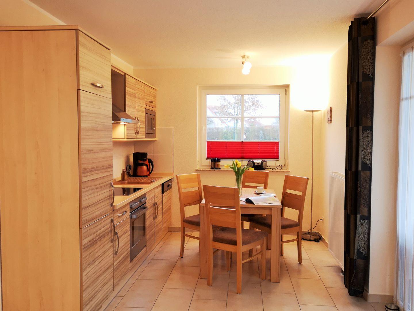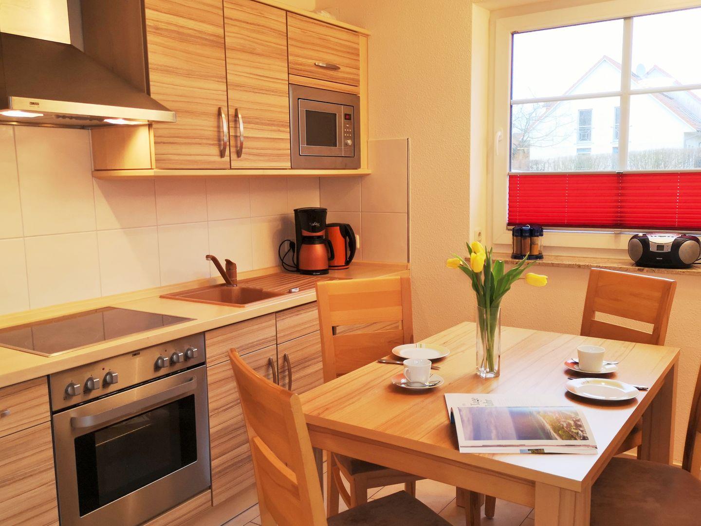 Die offene Küche beinhaltet eine voll ausgestattete Einbauküchenzeile mit 4-Platten-Ceran-Kochfeld, Backofen, Dunstabzug, Mikrowelle, Kühlschrank mit Gefrierfach, Geschirr-spülmaschine, Kaffeemaschine, Wasserkocher und Toaster. Die Küche ist mit Geschirr, Gläsern, Besteck und Töpfen bestens und ausreichend ausgestattet.