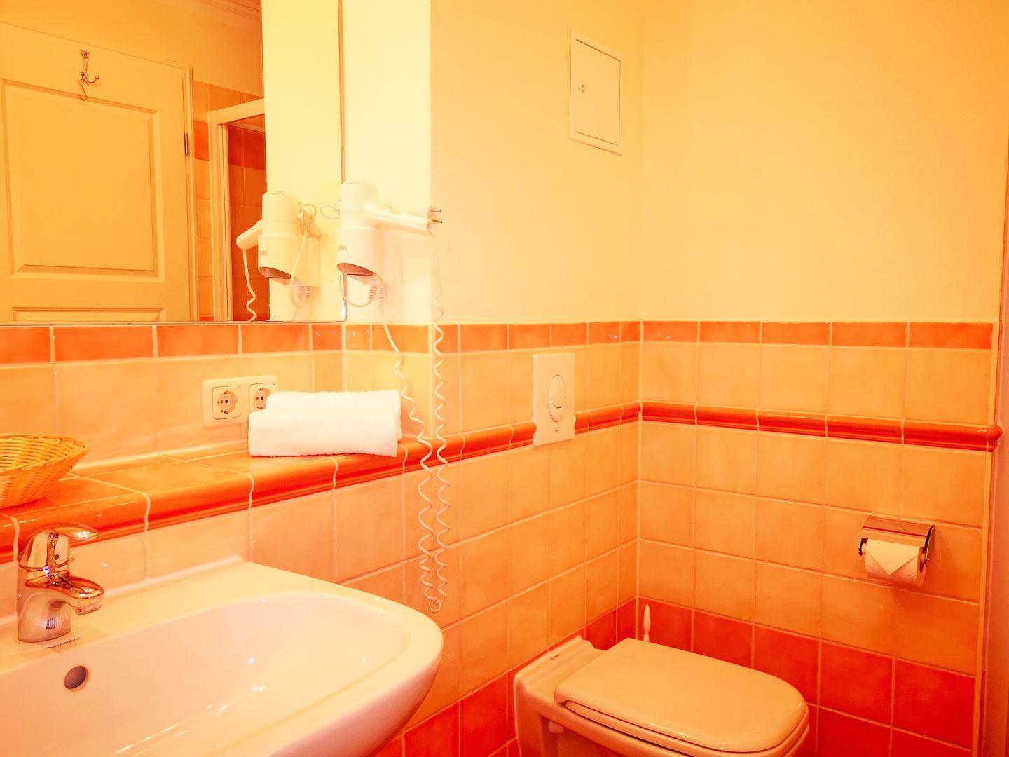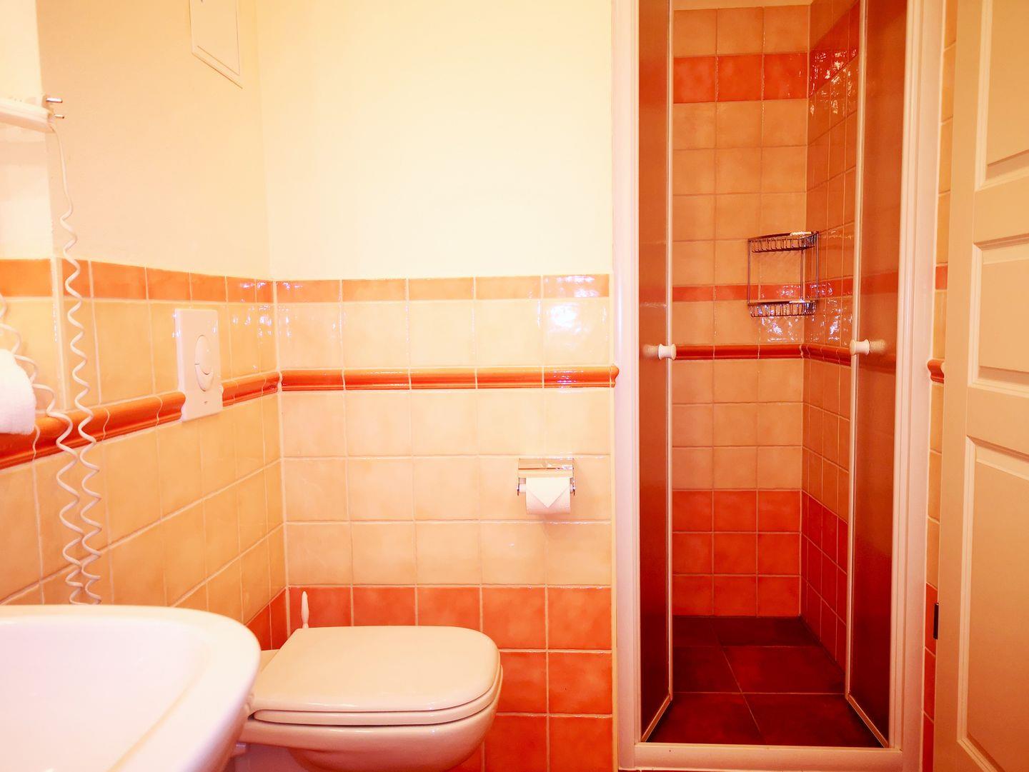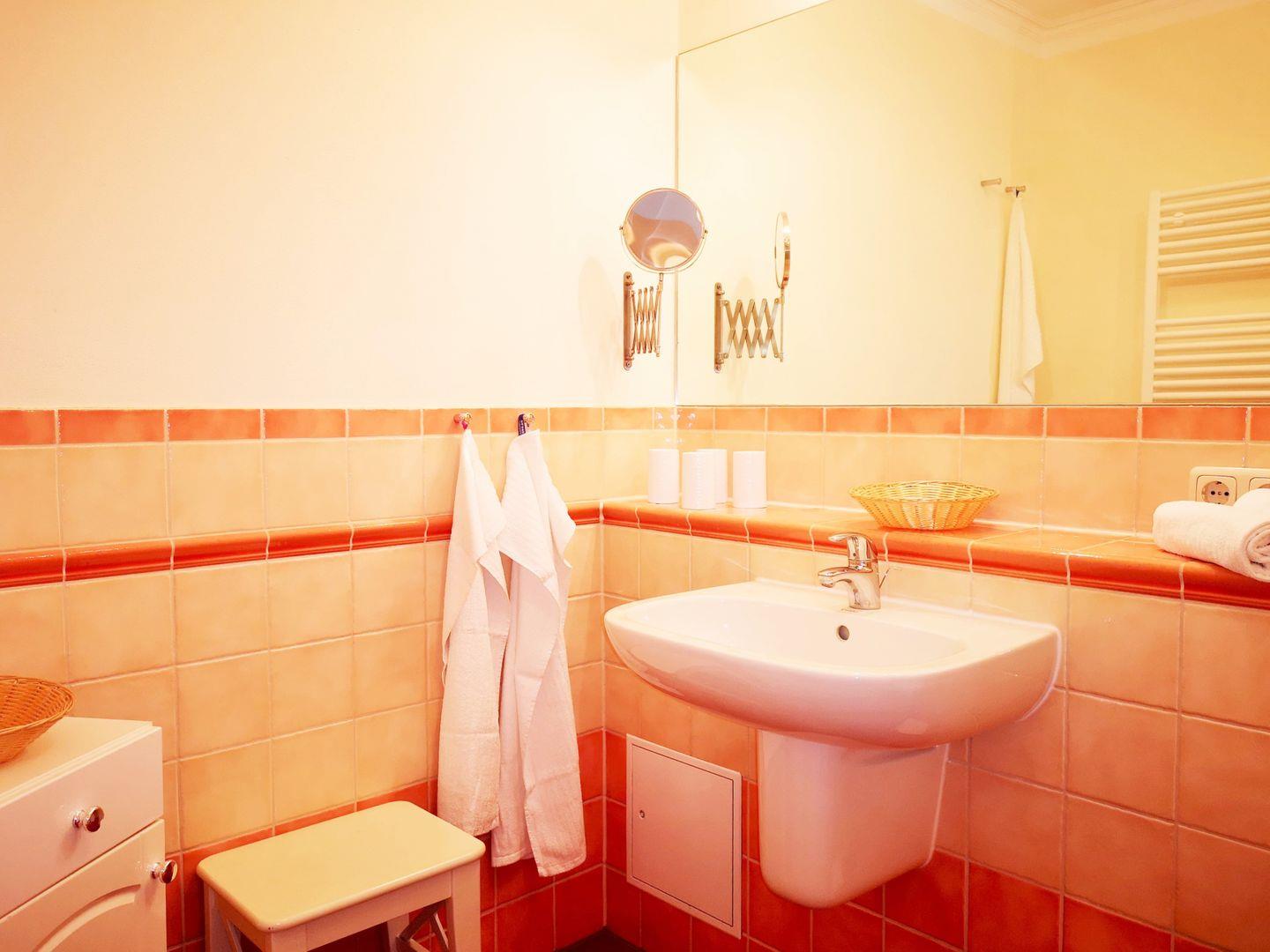 Das mediterran anmutende Badezimmer verfügt über eine Dusche mit (senioren-freundlichem!) niedrigem Einstieg, Waschbecken, WC, Föhn, Kosmetikspiegel, einen Handtuch-Heizkörper sowie ausreichend Ablagemöglichkeiten.