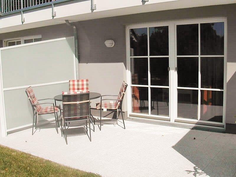 Das sehr gemütliche, moderne und geräumige Wohn-/Esszimmer verfügt über eine separate Sitzgruppe mit bequemer Couch, Sesseln und Couchtisch, einen separaten Esstisch mit 4 Stühlen, ein Sideboard sowie verschiedene Regale und Schränke. Vom Wohnzimmer aus haben Sie direkten Zugang zu der ca. 10 m² großen und sonnigen Terrasse (nach Süd-Westen ausgerichtet) mit Gartenmöbeln. Hier sitzen Sie entspannt und gemütlich mitten im Grünen und können abends bei einem guten Glas Wein in Ruhe die lauen Sommernächte genießen!