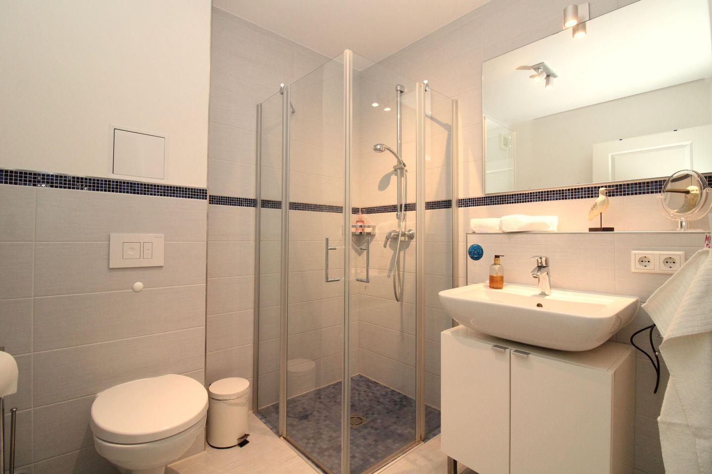 Das moderne Badezimmer verfügt über eine Dusche mit bodengleichem und seniorenfreundlichem Einstieg mit Echtglas-Duschtrennwand, Waschbecken und WC, einen Handtuch-Heizkörper, Föhn sowie ausreichend Ablagemöglichkeiten.