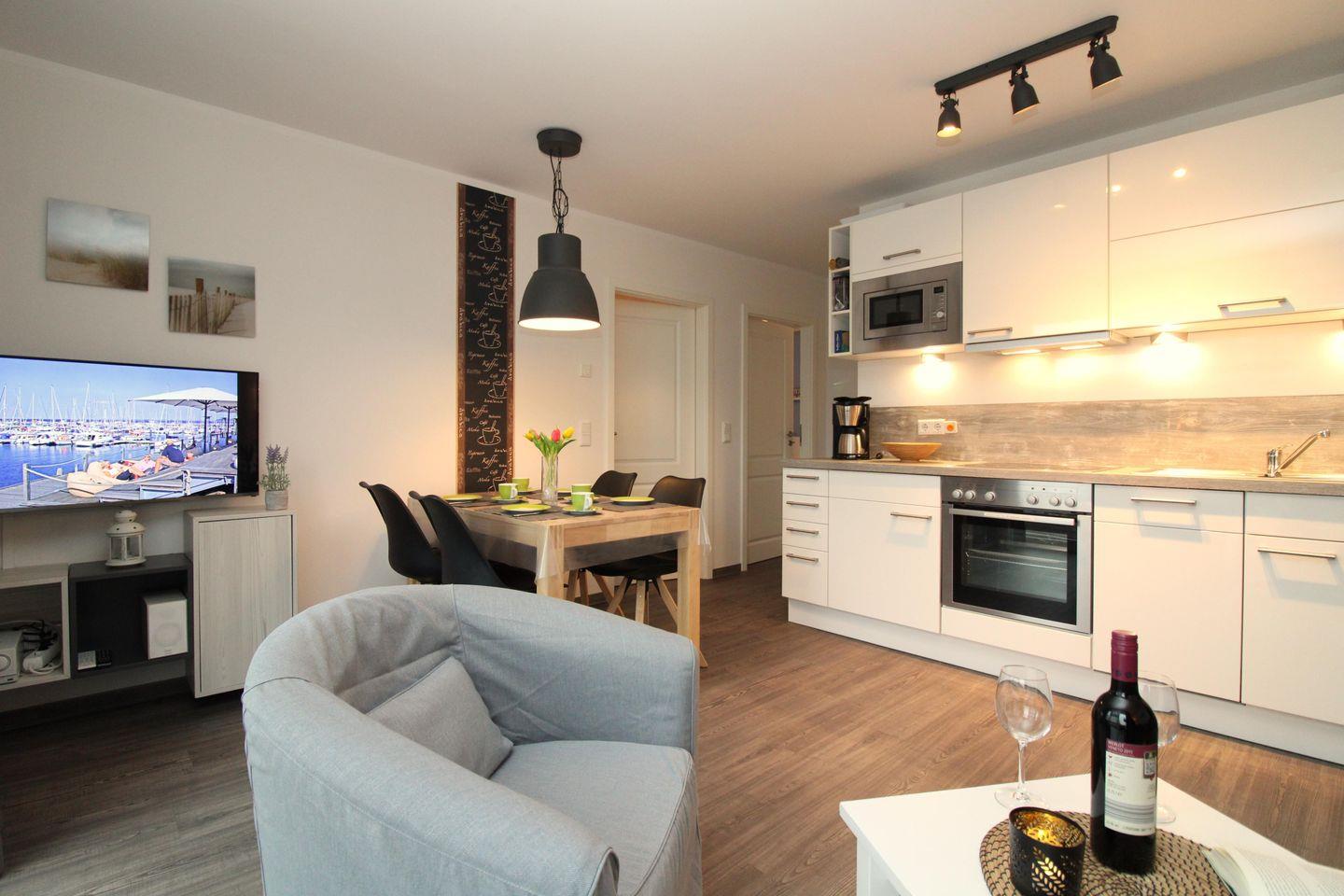 Der offene Küchenbereich beinhaltet eine voll ausgestattete Einbauküchenzeile in gehobener Ausstattung mit 4-Platten-Ceran-Kochfeld, Backofen, Dunstabzug, Mikrowelle, Kühlschrank mit Gefrierfach, Geschirrspülmaschine, Kaffeemaschine, Wasserkocher und Toaster. Die Küche ist mit Geschirr, Gläsern, Besteck und Töpfen bestens und vollständig ausgestattet.