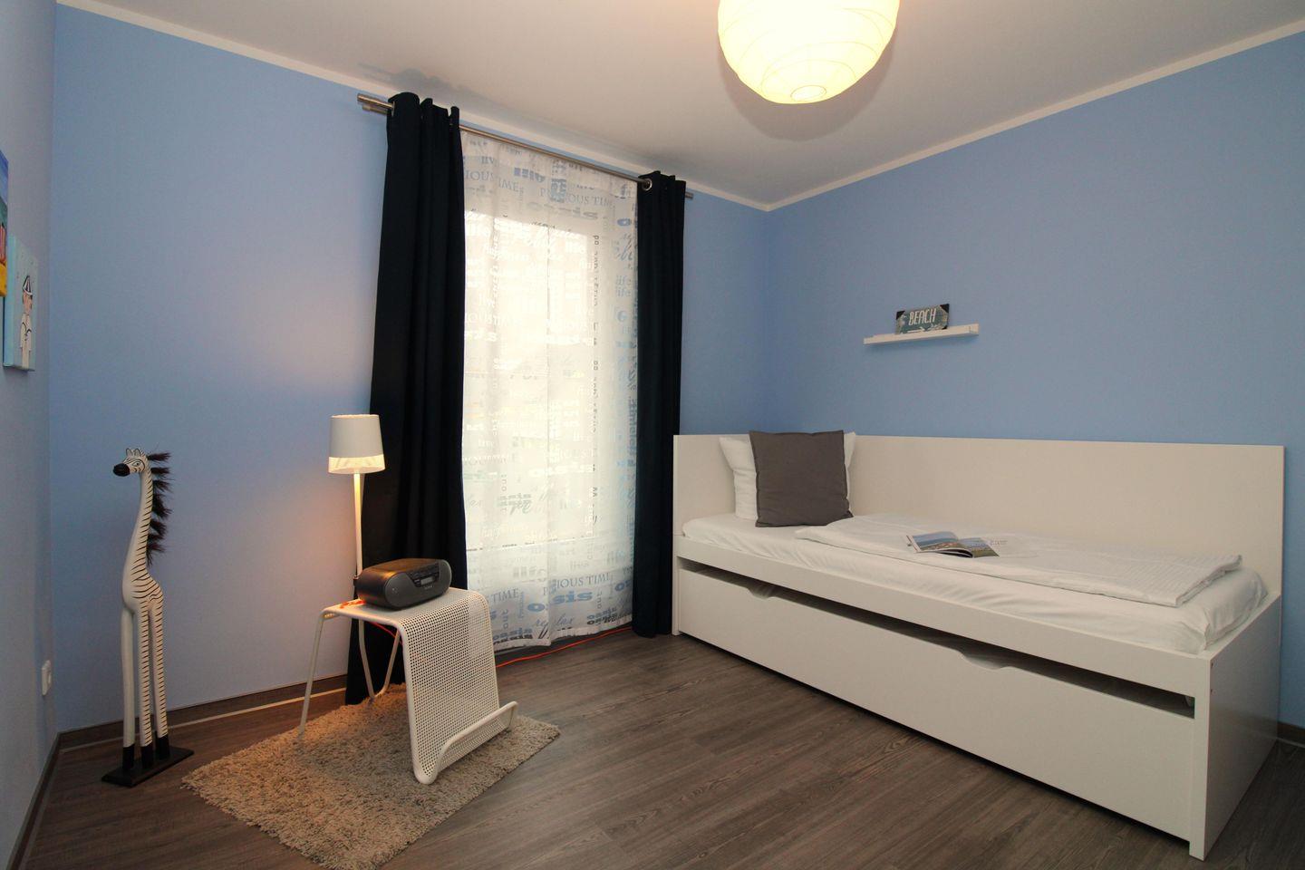 Das separate und freundliche 2. Schlafzimmer verfügt über ein bequemes und ausziehbares Einzelbett (90x200), Nachttisch sowie einen weiteren geräumigen Kleiderschrank