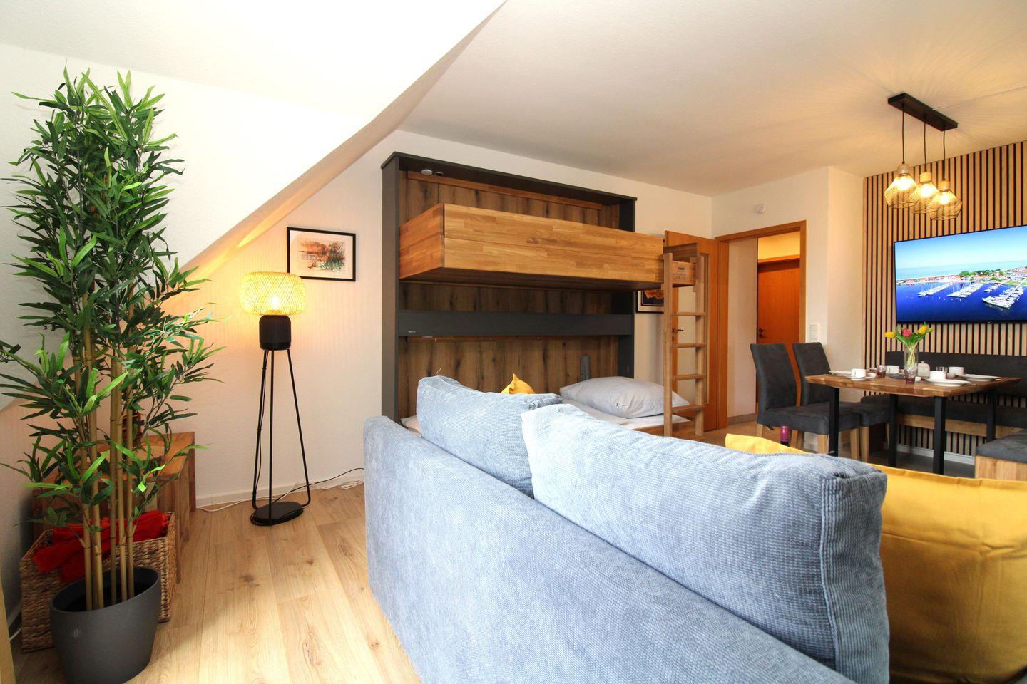 Zusätzliche bequeme Schlafmöglichkeiten für weitere 3. bis 6. Personen bieten die ausziehbare Schlafcouch (2 Pers.) bzw. ein ausklappbares Etagenbett (2 Einzelbetten) im Wohnzimmer.