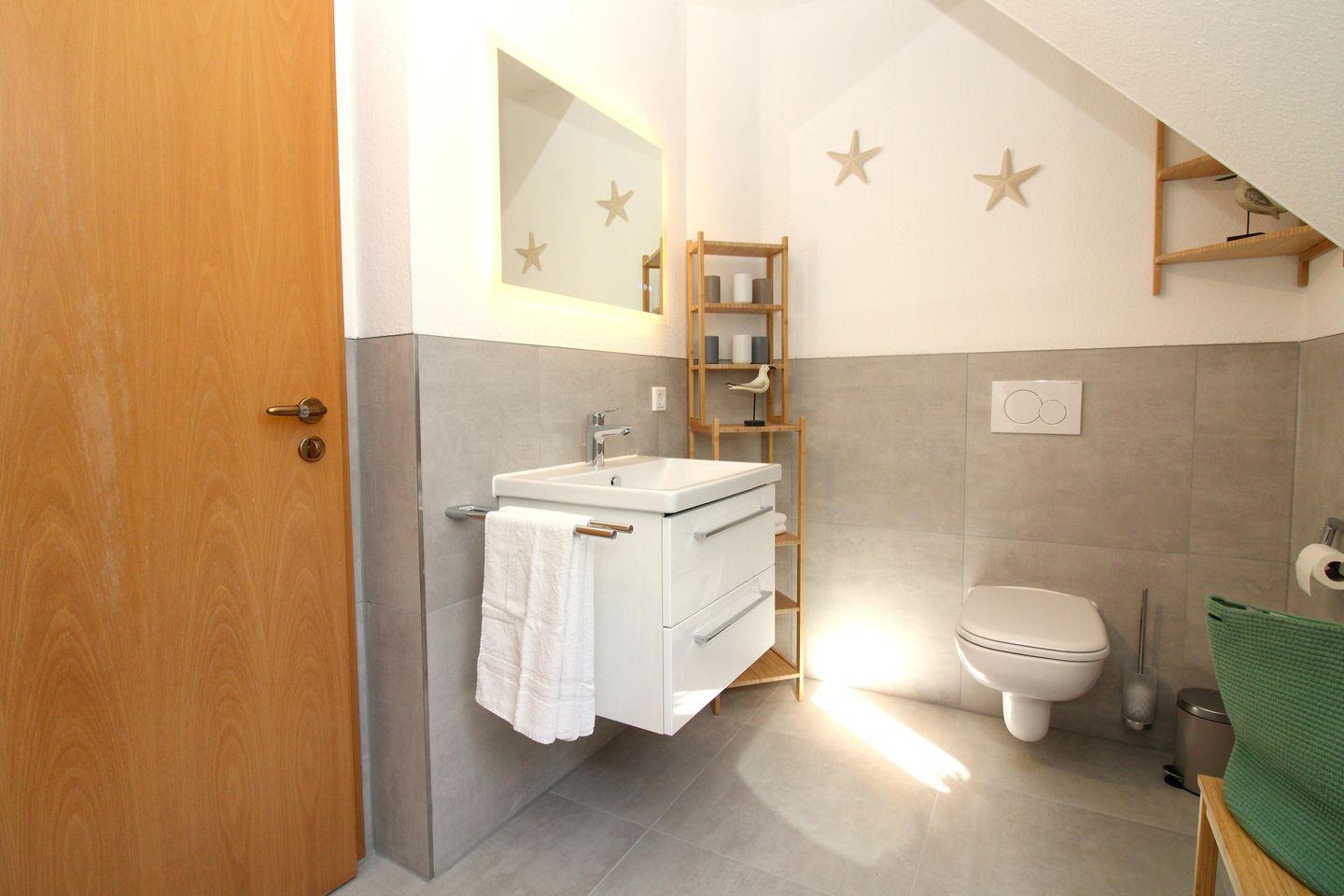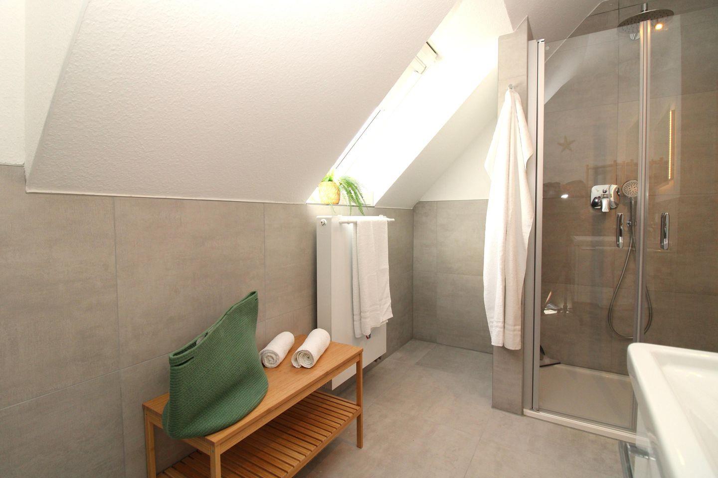Das moderne Badezimmer (mit Tageslicht / Fenster) verfügt über eine Echtglas-Dusche mit bodentiefem Einstieg (seniorenfreundlich!), Waschbecken mit Unterschrank, WC, Kosmetikspiegel, Föhn, Handtuch-Heizkörper sowie ausreichend Ablagemöglichkeiten.