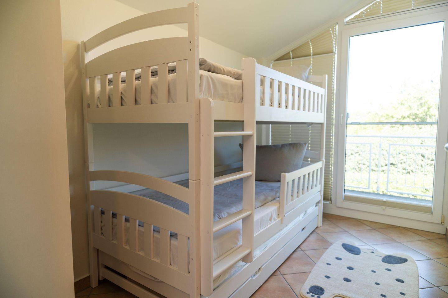 Schlafzimmer mit Doppelbett und Kleiderschrank, Kinderzimmer mit Etagenbett (3 Betten) und Kleiderschrank