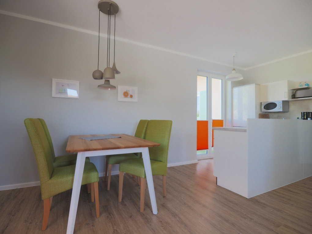 Helle, stilvoll eingerichtete 2-Zimmer-Wohnung im Erdgeschoss mit gemütlichem Schlafsofa im Wohnbereich – ideal für entspannte Stunden zu zweit oder mit Freunden. Die offene Küche mit Essbereich geht elegant in den Wohnbereich mit TV über, sodass Kochen, Essen und Relaxen harmonisch verbunden sind. Von hier aus gelangen Sie direkt auf die sonnige Westterrasse mit Gartenmöbeln – perfekt für ein Frühstück im Freien oder einen entspannten Abend bei einem Glas Wein.