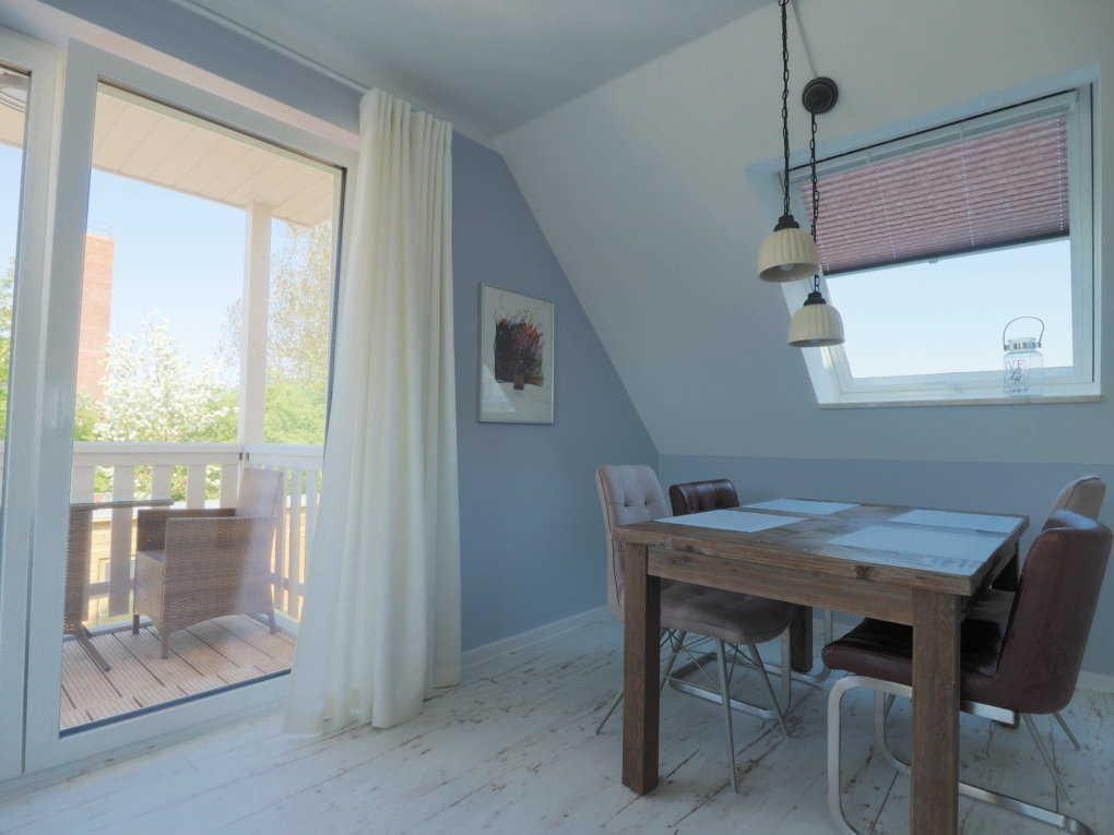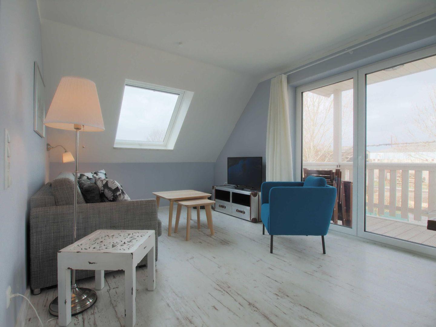 Die helle 2-Zimmer-Wohnung im Obergeschoss verfügt über ein Wohnzimmer mit Schlafsofa, offene Küche mit Sitzecke und TV sowie Zugang zum Balkon mit Gartenmöbeln. Das Schlafzimmer bietet ein Doppelbett, großen Kleiderschrank, TV und Ablagemöglichkeiten. Das moderne Duschbad ist mit Föhn und Kosmetikspiegel ausgestattet. Hund erlaubt.