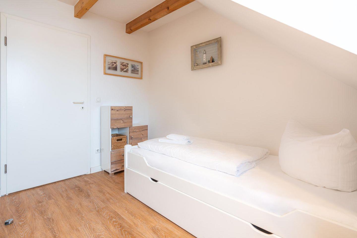Das kleinere Schlafzimmer befindet sich auf der unteren Ebene und verfügt über ein Einzelbett, aus dem sich eine zweite Matratze ausziehen lässt. Vom Wohnbereich gelangen Sie über eine Treppe auf die offene Galerie. Hier finden Sie ein bequemes Doppelbett und – das zweite Highlight der Wohnung – ein großzügiges Ankleidezimmer mit viel Stauraum für die Urlaubsgarderobe.