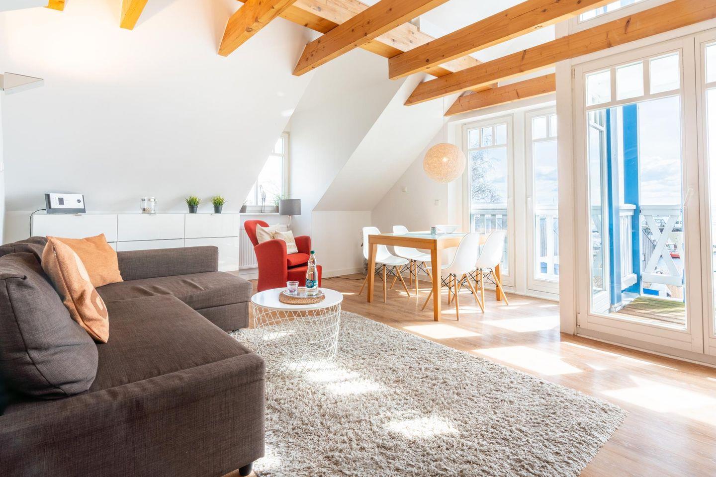 Die im skandinavischen Stil eingerichtete Wohnung verläuft über 2 Ebenen und bietet Platz für bis zu 4 Personen. Für eine ganz besondere Atmosphäre sorgt die schöne Holzbalkendecke. Sowohl vom überdachten Balkon als auch vom Wohnzimmer aus genießen Sie einen traumhaften Wasserblick auf das Salzhaff mit seinem kleinen Fischereihafen. Bodentiefe Fenster sorgen nicht nur für eine fantastische Aussicht, sondern auch für angenehme Helligkeit zur dunkleren Jahreszeit. Zu der Wohnung gehört ein PKW-Stellplatz, den Sie kostenfrei nutzen können. Mitgebrachte Fahrräder werden im hauseigenen Fahrradschuppen sicher abgestellt.
