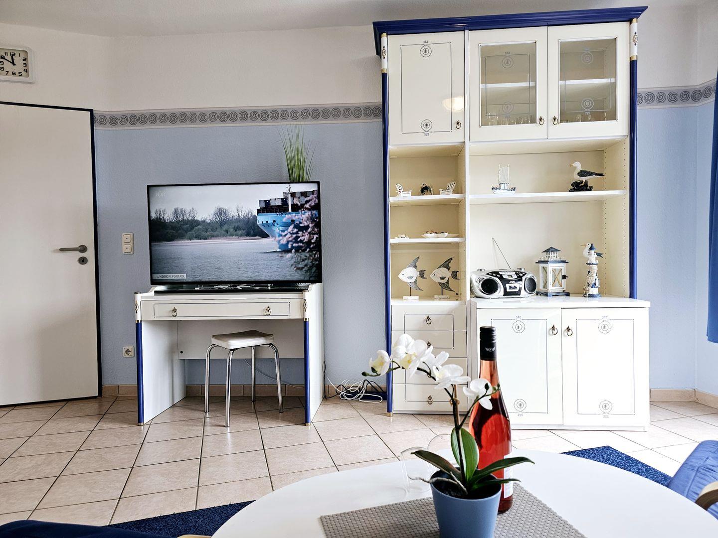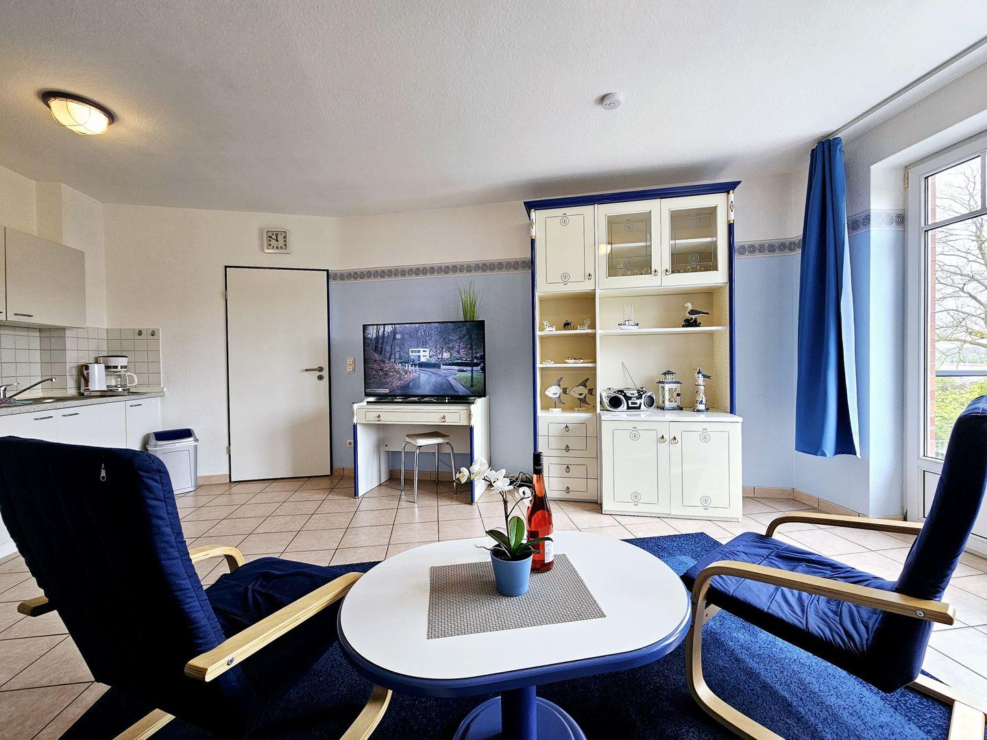 Diese liebevoll eingerichtete 2-Zimmer-Ferienwohnung begeistert mit einer geschmackvollen Einrichtung im maritimen Stil und einem durchdachten Wohnkonzept. Der helle Wohnbereich öffnet sich zum Balkon, von dem aus Sie einen herrlichen Blick auf das Salzhaff genießen können – ein idealer Ort, um den Morgenkaffee mit Sonnenlicht und Meeresluft zu verbinden oder den Abend beim Sonnenuntergang ausklingen zu lassen.