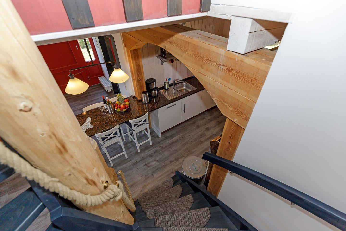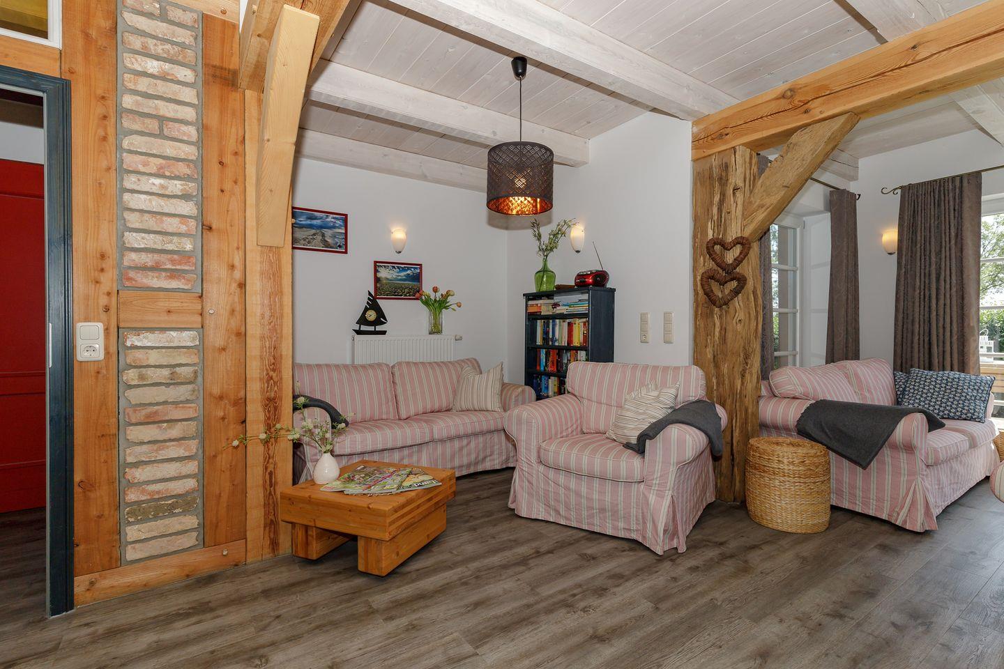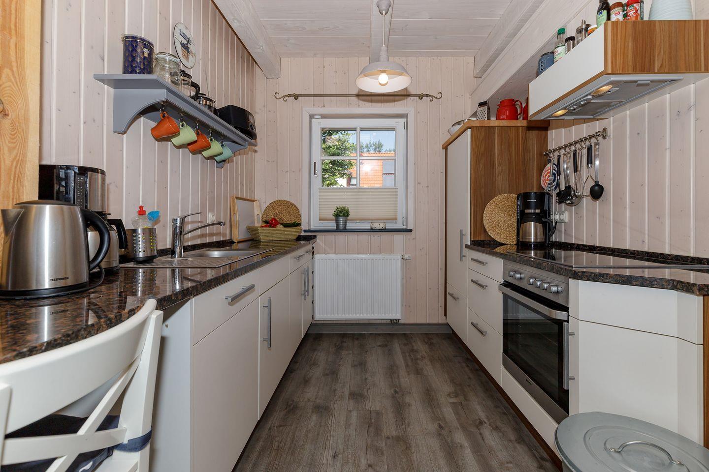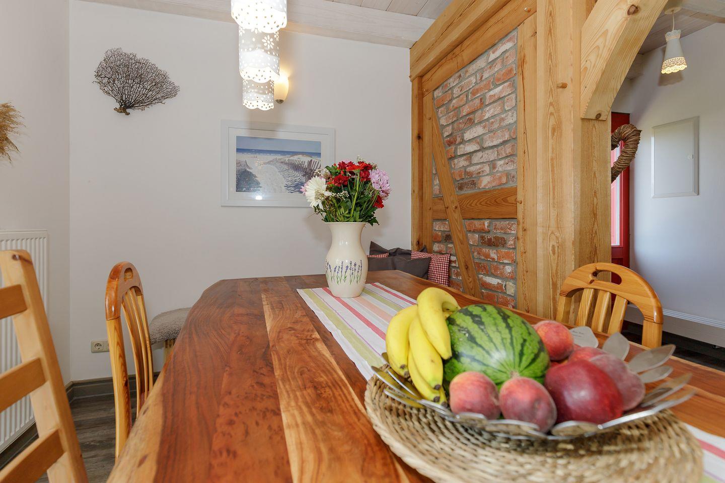 Die moderne Wohnküche ist vollständig ausgestattet – vom Ceranfeld bis zur Spülmaschine – und wird schnell zum Herzstück des Hauses. Hier entstehen beim gemeinsamen Kochen und Genießen die schönsten Urlaubsmomente. Für gemeinsame Mahlzeiten steht ein großer Esstisch bereit, an dem alle zusammenkommen können.