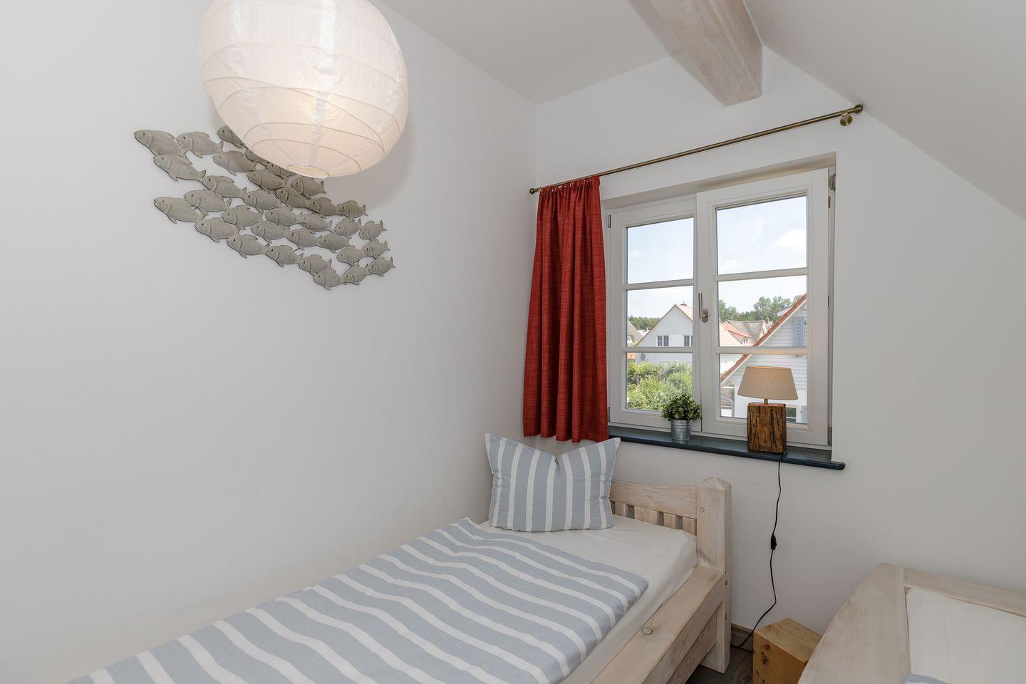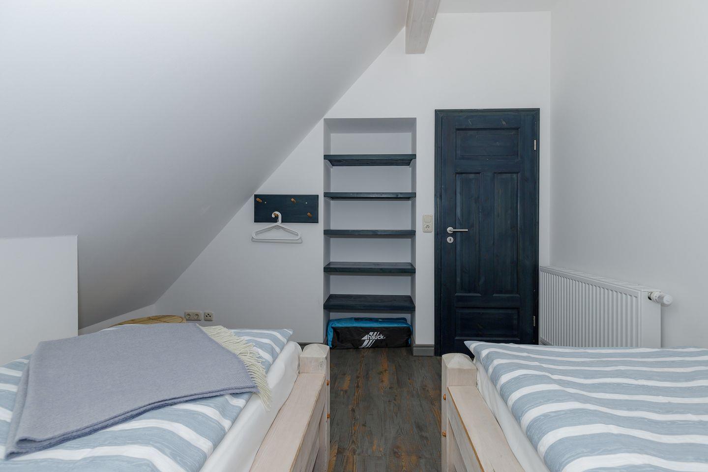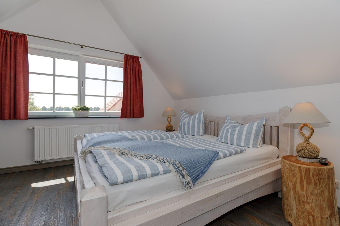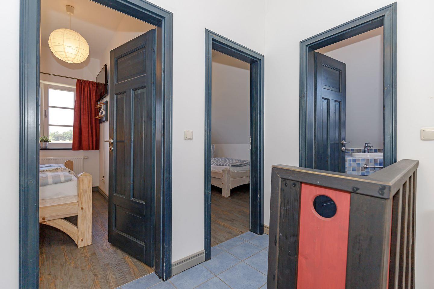 Insgesamt fünf geschmackvoll eingerichtete Schlafzimmer sorgen für erholsame Nächte. Die Einrichtung kombiniert natürliche Materialien, helle Farben und maritime Akzente – für das Gefühl, direkt an der Ostsee zu wohnen. Zwei moderne Badezimmer mit Dusche und Fußbodenheizung bieten zusätzlichen Komfort.