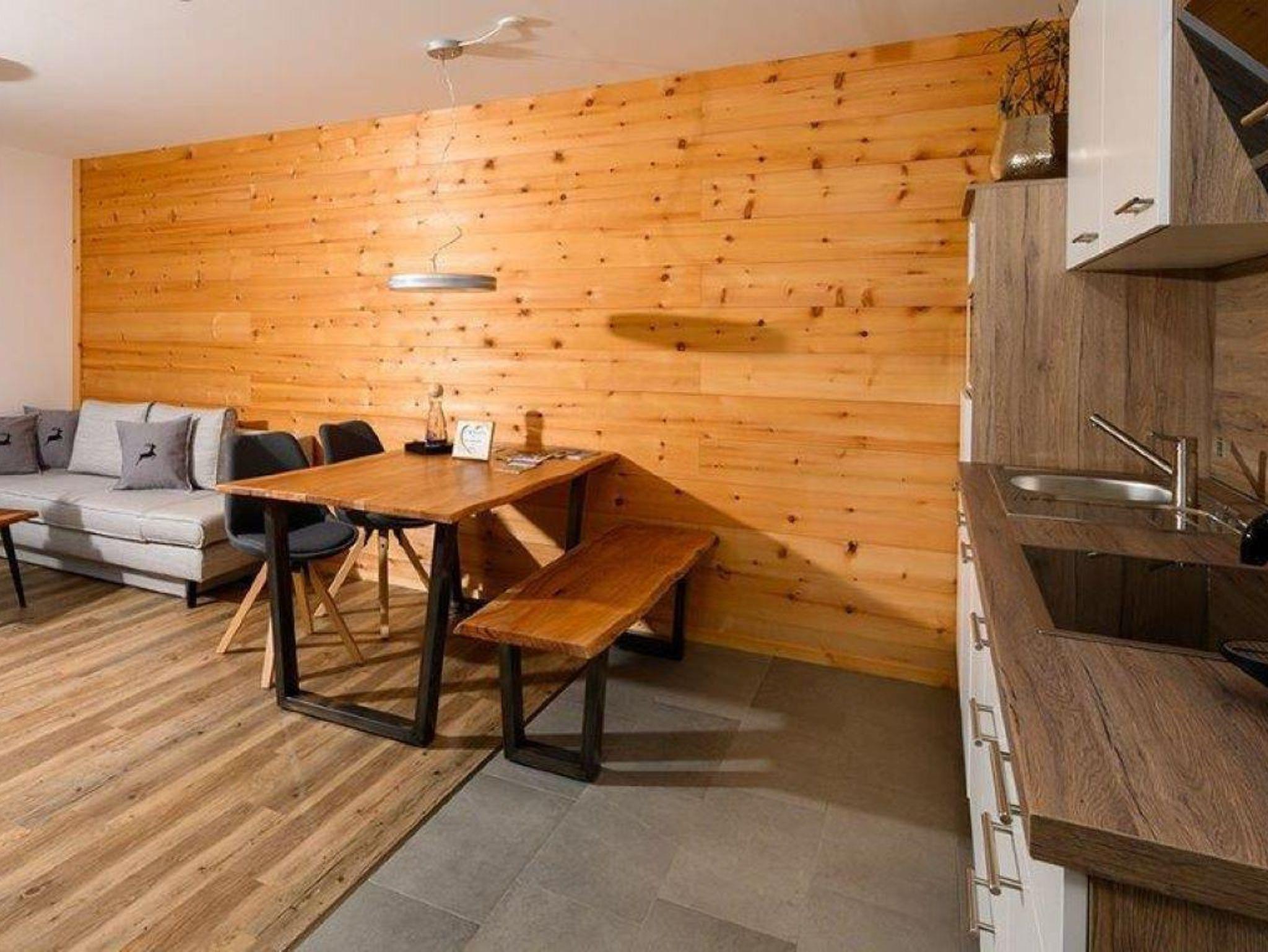 Das Schlafzimmer und auch der Wohnbereich sind teilweise mit Zirbenholz-Panelen verkleidet, welche eine beruhigende Wirkung auf Geist und Körper haben.