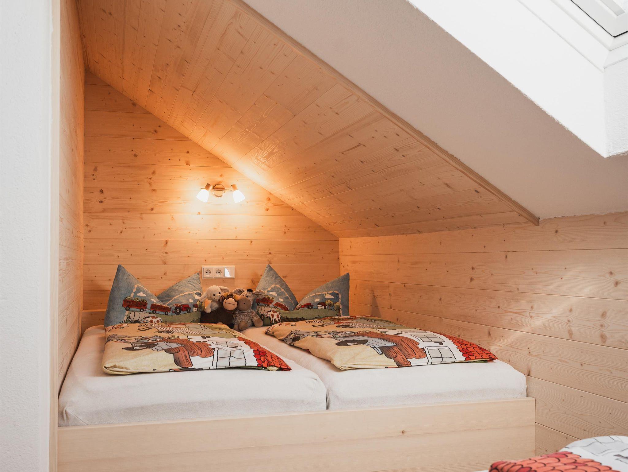 Das zweite Schlafzimmer ist ein Paradies für Kinder. Mit seinem hellen Ambiente und der gemütlichen Schlafkoje bietet es den idealen Rückzugsort für kleine Abenteurer. Ein zusätzliches drittes Bett ist perfekt für etwas ältere Kinder geeignet. Wie im ersten Schlafzimmer sorgt auch hier ein Dachflächenfenster für eine freundliche, sonnenverwöhnte Atmosphäre.