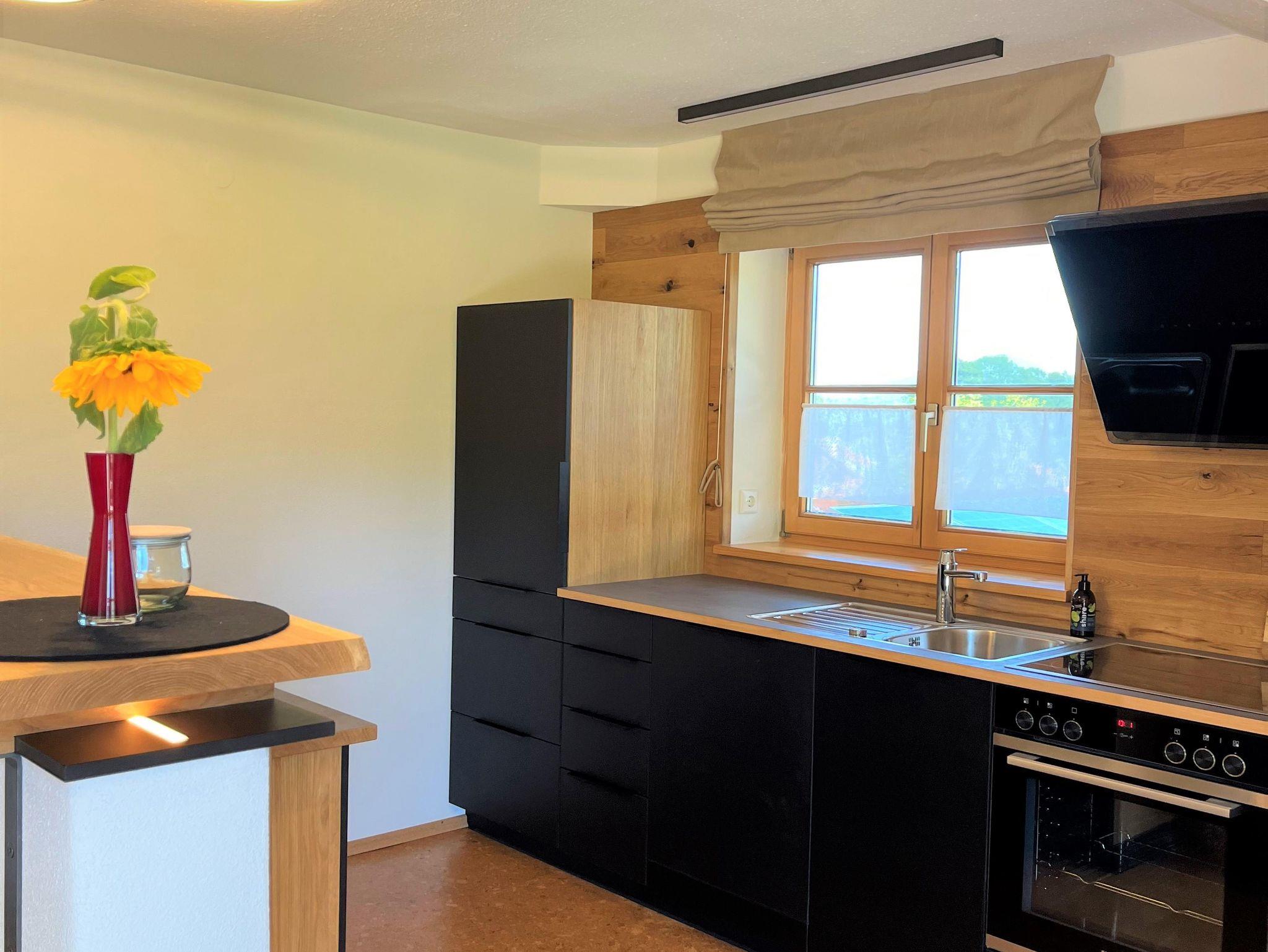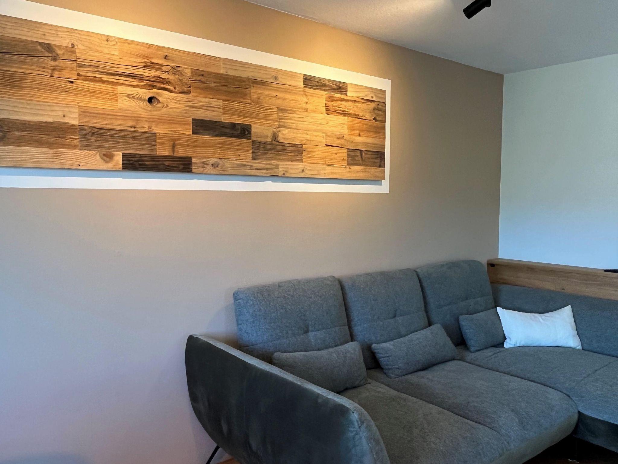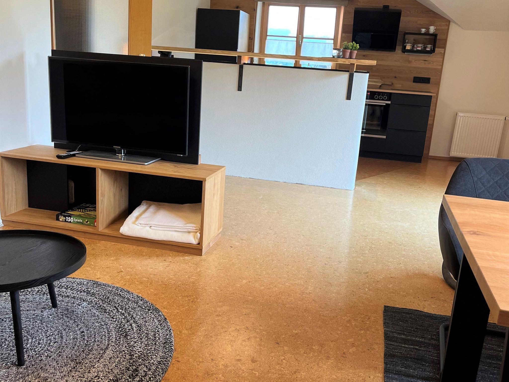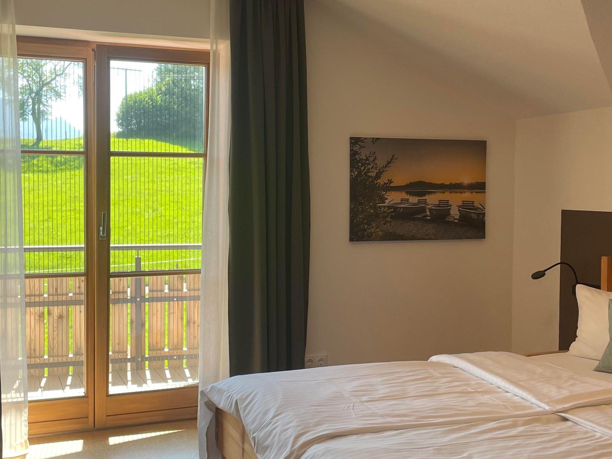 Dieser beinhaltet eine voll ausgestattete Küche, ein großes Sofa und einen Esstisch direkt mit Blick auf den Grünten. Die Ferienwohnung hat zwei Schlafzimmer. Ein Schlafzimmer mit Morgensonne in massiver Fichte und das zweite Schlafzimmer mit Blick auf den Grünten in massiver Zirbe. Beide Schlafzimmer sind voll verdunkelbar. Ein Badezimmer mit Regendusche und Aussenfenster und einer Physiotherm- Zirben-Infrarotkabine.