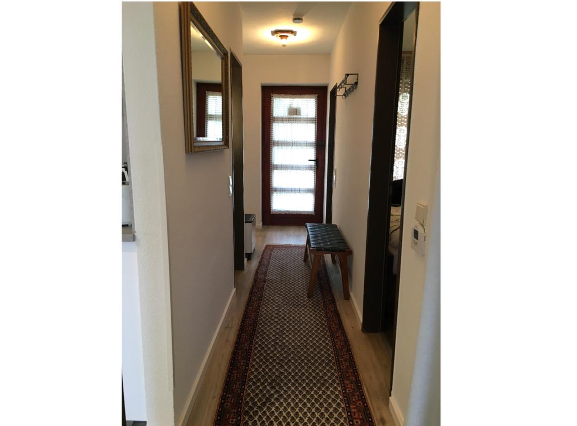 Im langen Flur gibt es eine Bank zum Schuhe anziehen und Kleiderhaken. Von hier aus geht es in den offenen Wohn- und Essbereich. Dieser ist ausgestattet mit hellem Ledersofa, 2 hellen Ledersesseln, Glascouchtisch und Glasbeistelltisch. Für Unterhaltung sorgen Flachbild-TV, Radio und kostenloses WLAN. Der Esstisch lädt zu Spieleabenden ein (Gesellschaftsspiele sowie Kinderbücher). Ein Kinderhochstuhl wird auf Anfrage kostenfrei zur Verfügung gestellt.