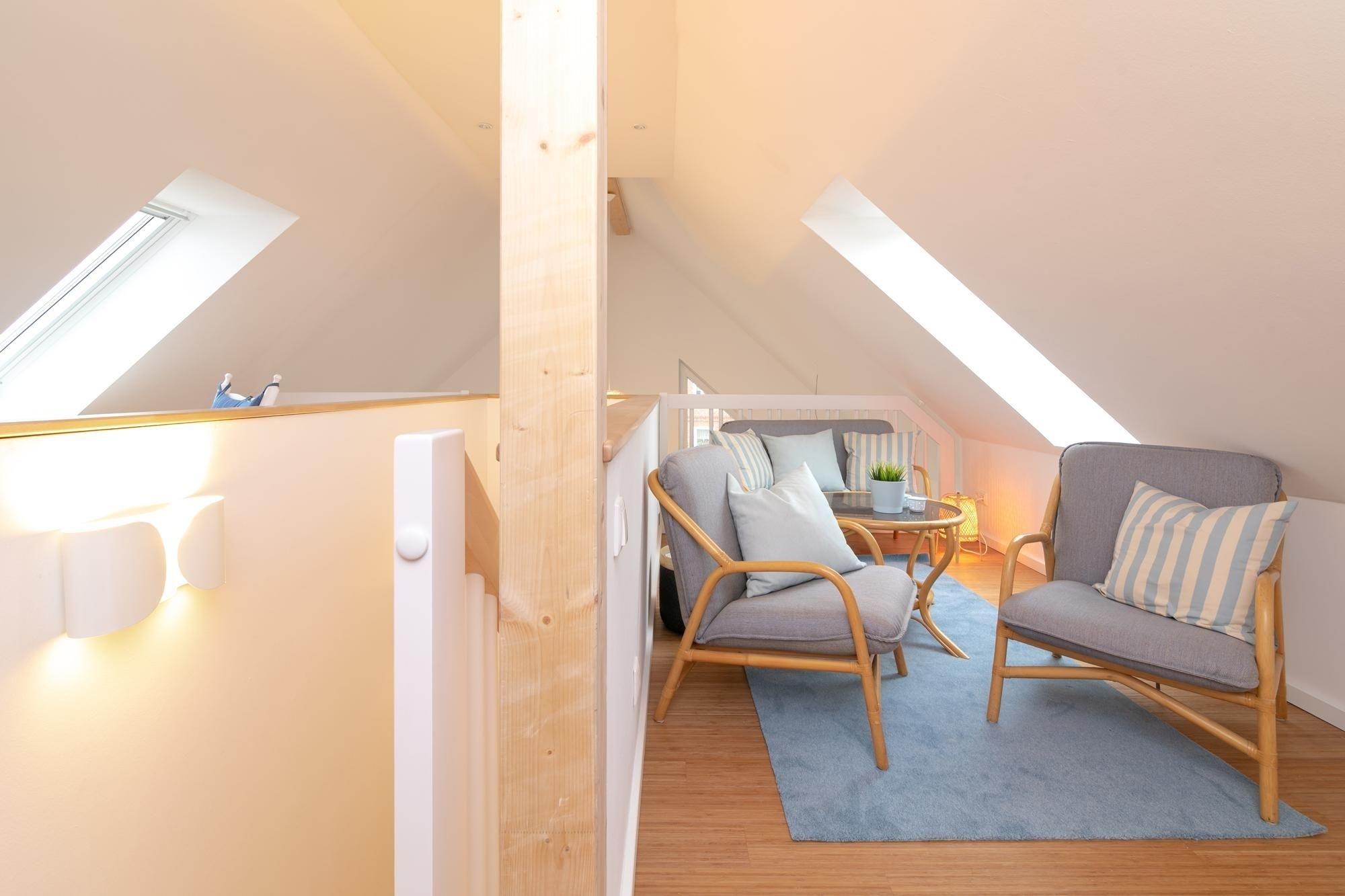 Vom geräumigen Flur gelangen Sie in die offen gestaltete Wohnküche, mit gut ausgestatteter Küchenzeile. Ein lichtdurchfluteter Galeriebereich sorgt für luftige Großzügigkeit. Ein wohliger Ofen, ein großer Esstisch, eine gemütliche Couch und liebevoll platzierte Dekoration bilden das Interieur. Vom Wohnzimmer haben Sie Zutritt zum eigenem Garten mit Terrasse und Strandkorb. Lassen Sie hier am Abend entspannt schöne Urlaubstage ausklingen oder genießen Sie schon den ersten Kaffee am Morgen mit einer frischen Ostseebrise in der Nase. Ein großes Wohlfühlbad mit bodentiefer Walk-In Dusche, Fenster, Handtuchheizung, finnischer Sauna für 3-4 Personen und im Außenbereich während der frostfreien Zeit, eine Dusche sowie ein Gäste-WC perfektionieren dieses schöne Ferienhaus. Im 1. Obergeschoss erwarten Sie zwei Schlafzimmer - eines mit Boxspring-Doppelbett (2x 80x200 cm) und eines mit 2 Einzelbetten (je 90x200 cm). Über ein Treppe gelangen Sie in das stilvolle Dachgeschoss. Hier befinden sich ein Schlafzimmer mit einem Doppelbett (2x 90x200 cm) und einem Homeoffice-Platz für mobiles Arbeiten sowie eine gemütliche Lounge-Ecke im offenen Galeriebereich.