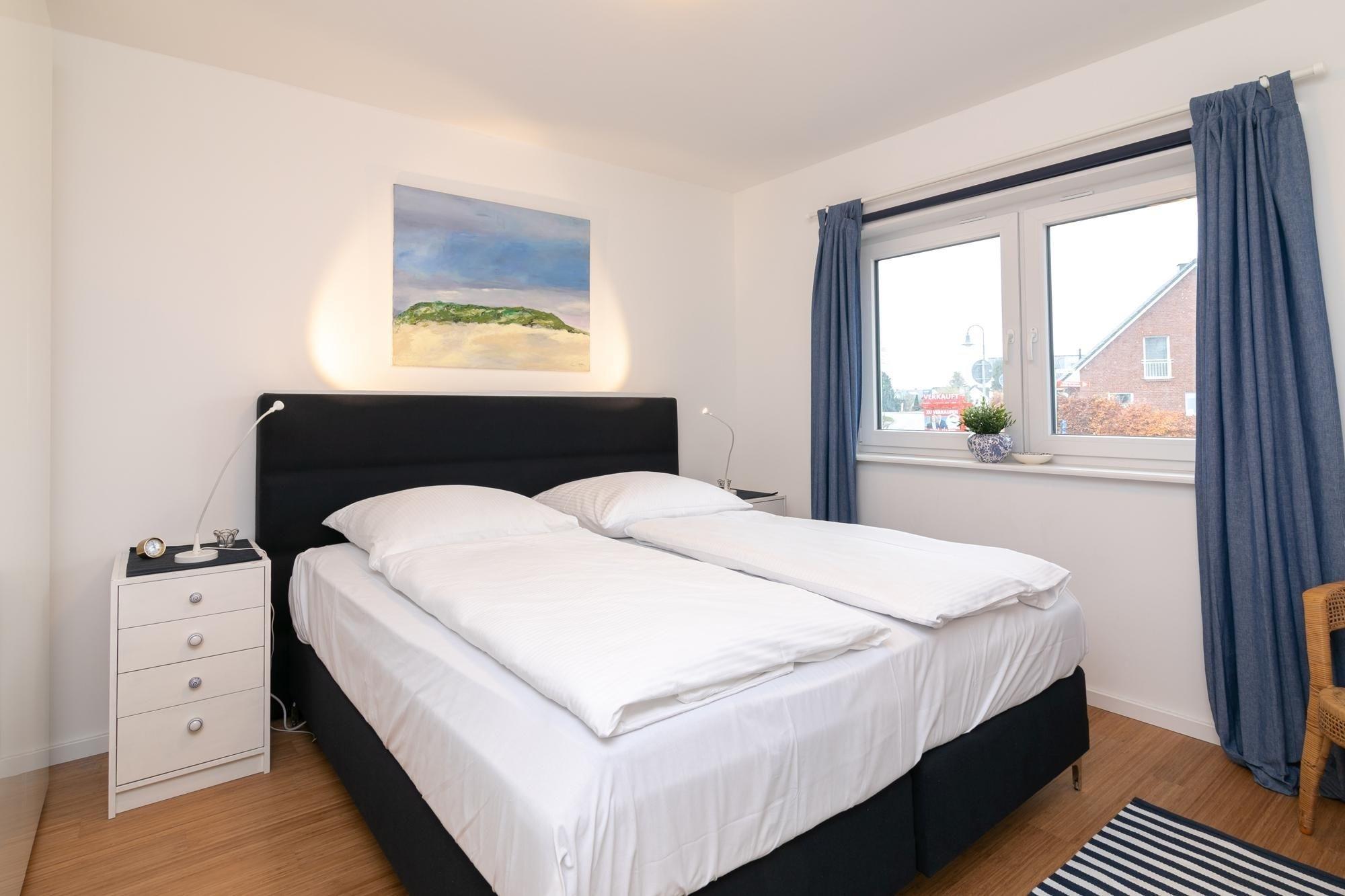 Schlafzimmer 1: 1 Boxspring-Doppelbett (2x 80x200 cm), Kleiderschrank, Verdunkelung (Plissees und Vorhänge)