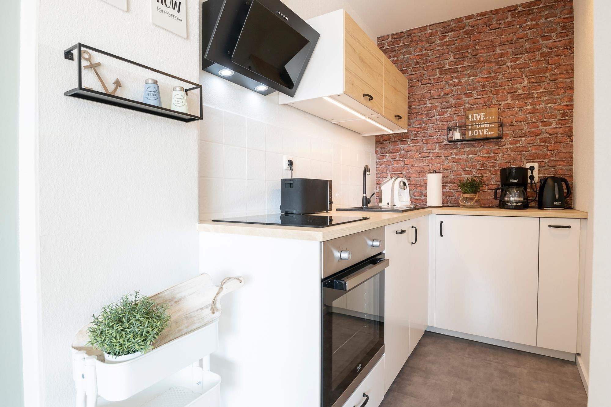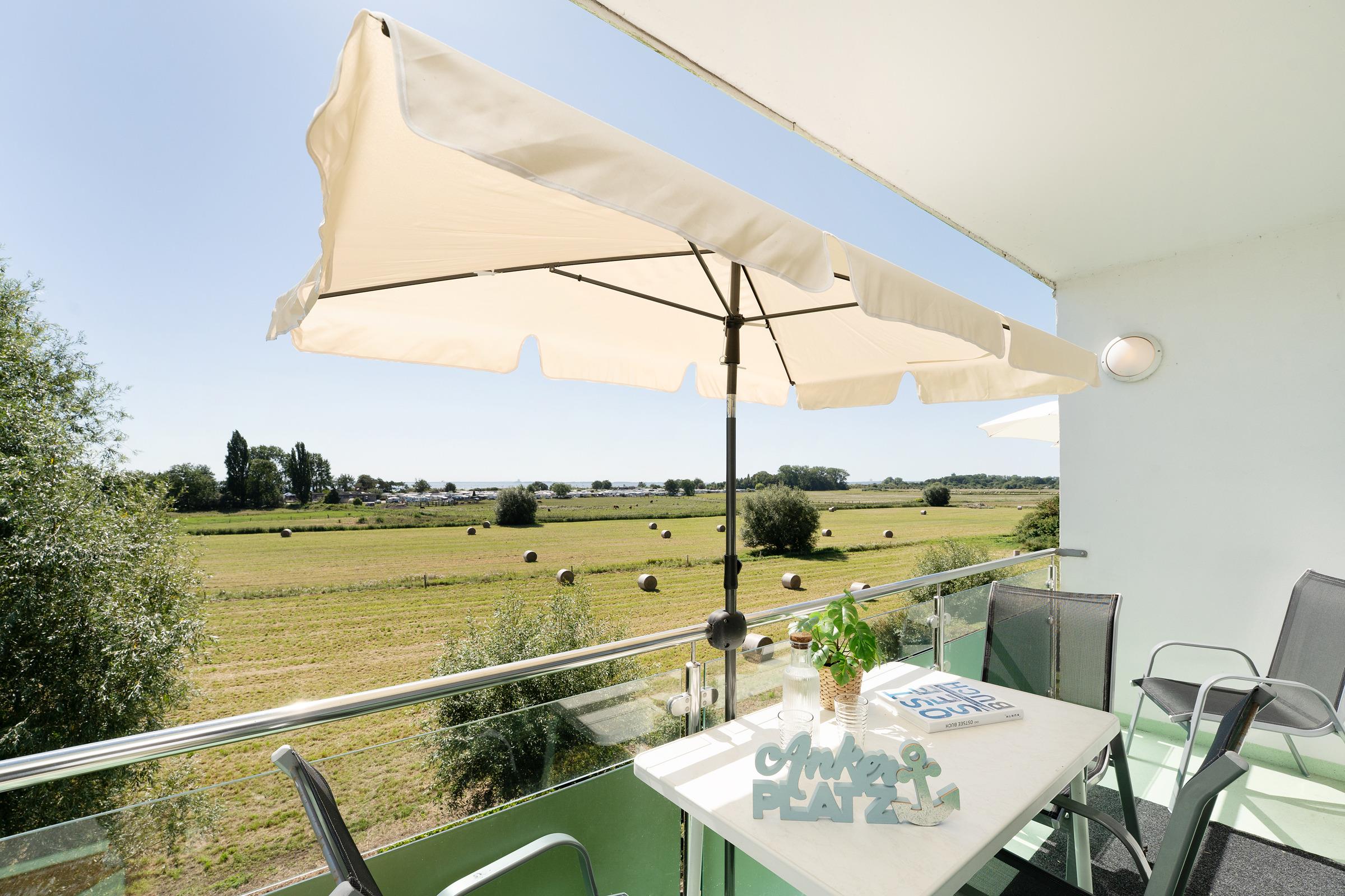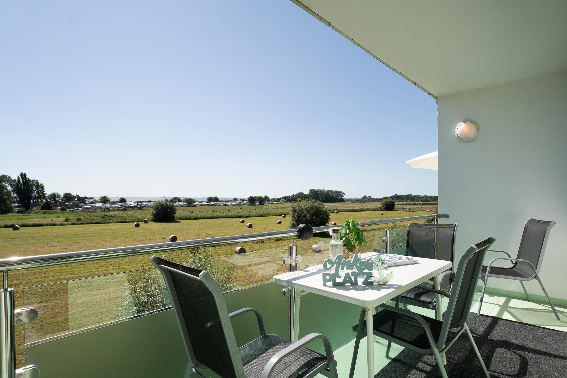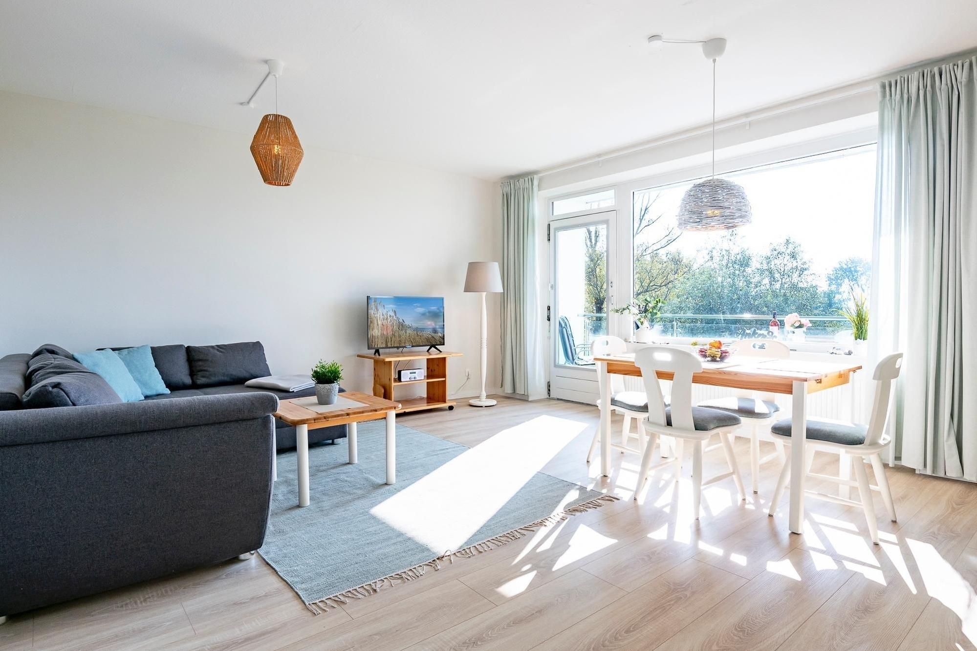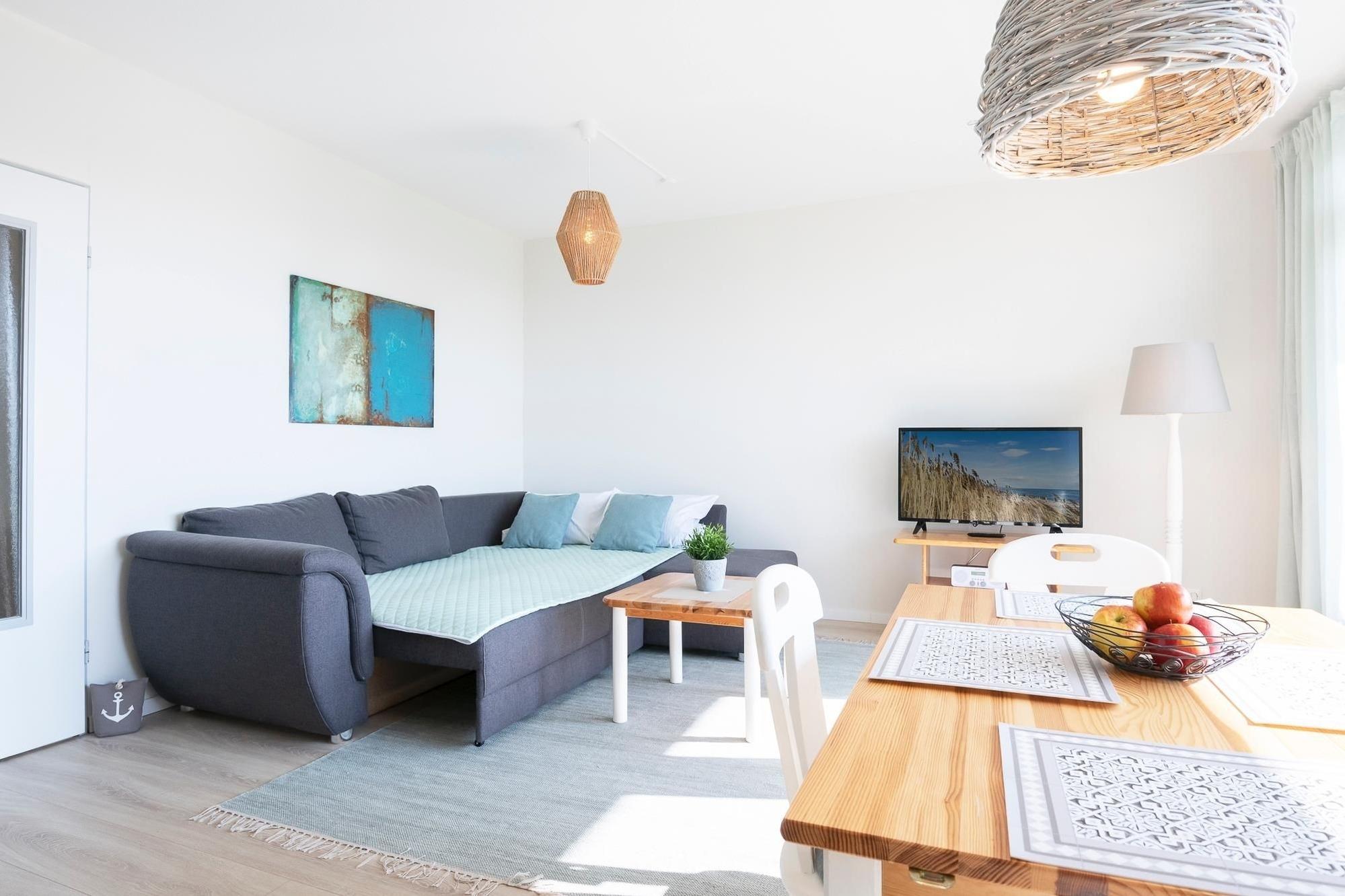Das bequeme Sofa im Wohnbereich beschert Ihnen entspannte und gesellige Stunden. In der gut ausgestatteten, offenen Küche können Sie sich mühelos selbst versorgen und leckere Köstlichkeiten zubereiten. Sogar den Abwasch müssen Sie im Urlaub nicht selbst erledigen, das übernimmt eine Spülmaschine für Sie. Auf dem möblierten Balkon mit Sonnenschirm bietet sich Ihnen eine einmalige Aussicht auf unsere wunderschöne Ostsee. Genießen Sie das Rauschen der Wellen und Rufen der Möwen bei einem Glas Wein, während Ihnen eine frische Brise um die Nase weht. Im separaten Schlafzimmer mit Kleiderschrank verbringen Sie im großen Doppelbett (2x 90x200 cm) komfortable Nächte. Im zweiten Schlafzimmer mit Kleiderschrank steht ein Etagenbett mit (je 90x200 cm) für zwei weitere Urlaubsgäste bereit. Das Tageslichtbad mit Badewanne und Fön rundet die Ausstattung dieser Ferienwohnung ab.