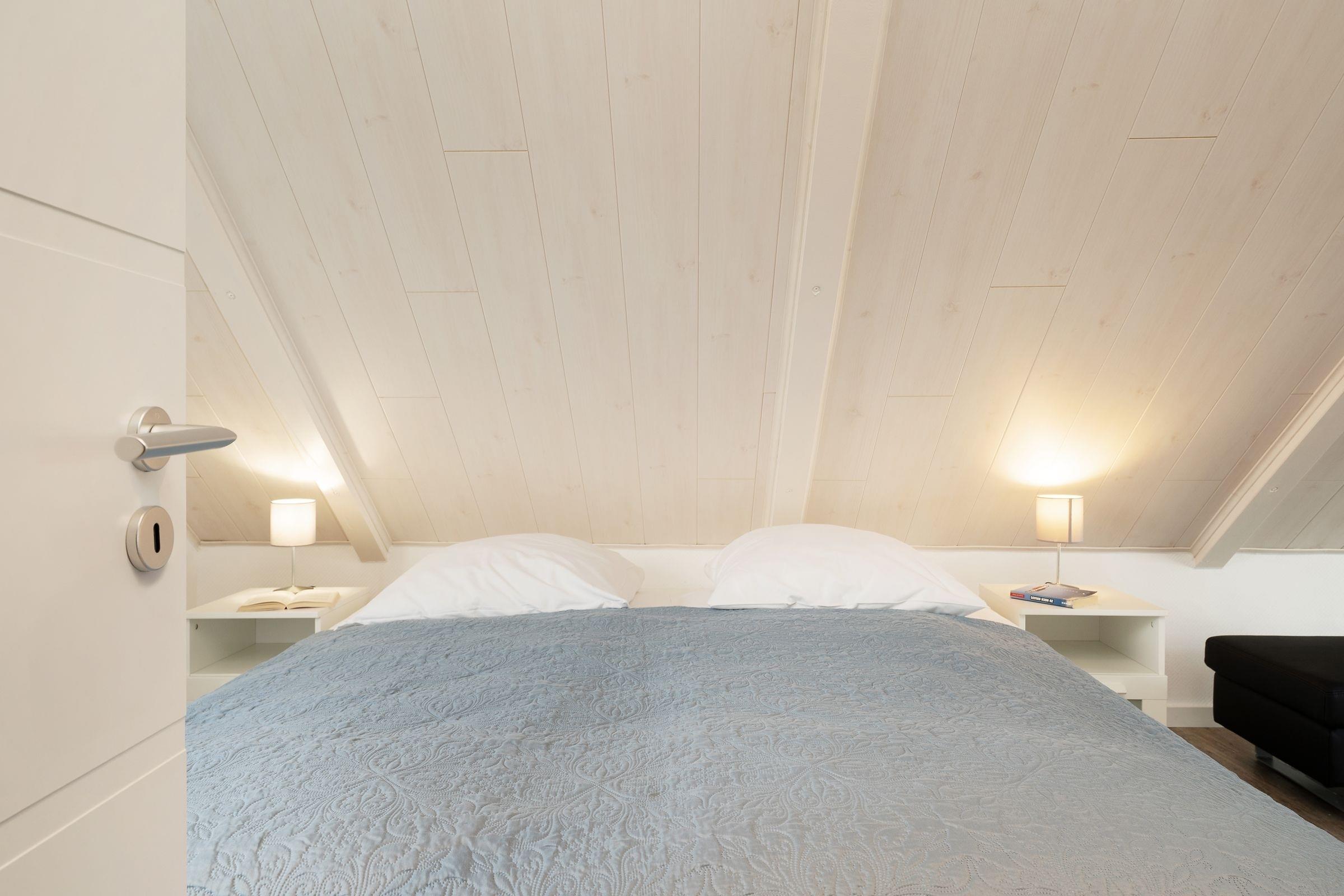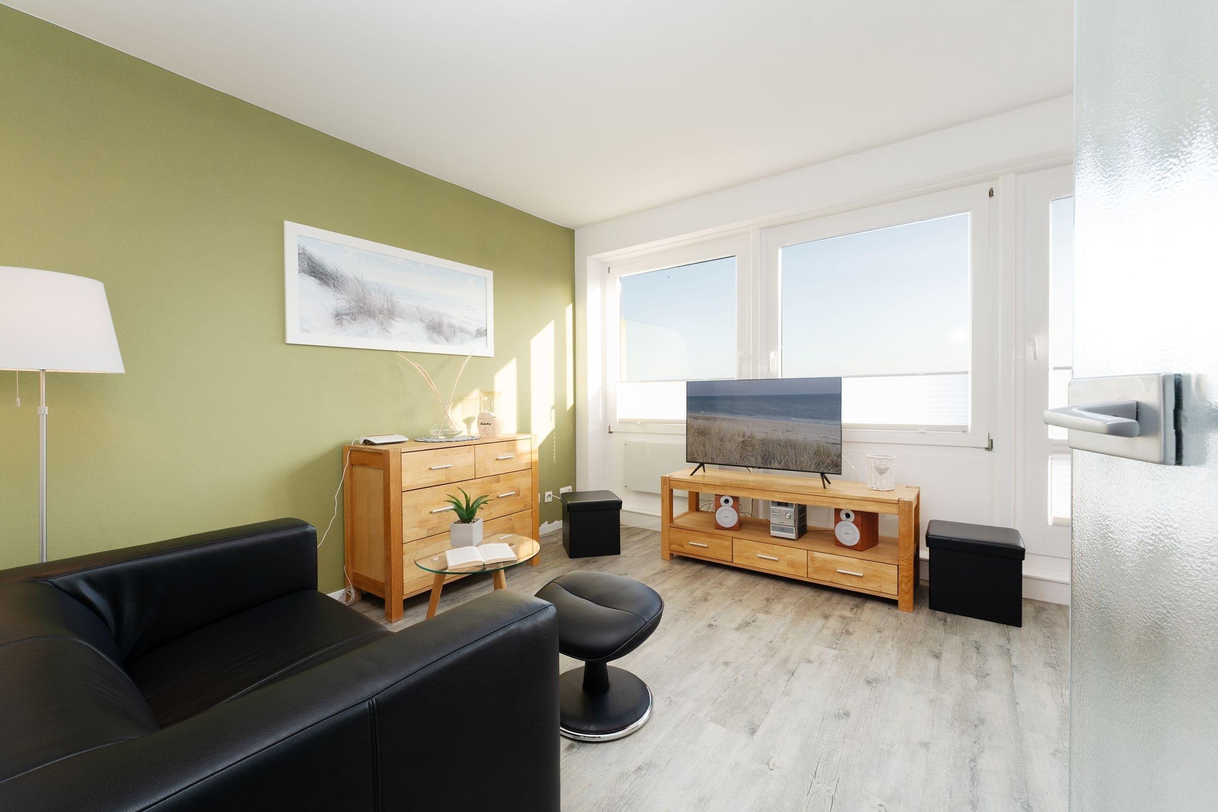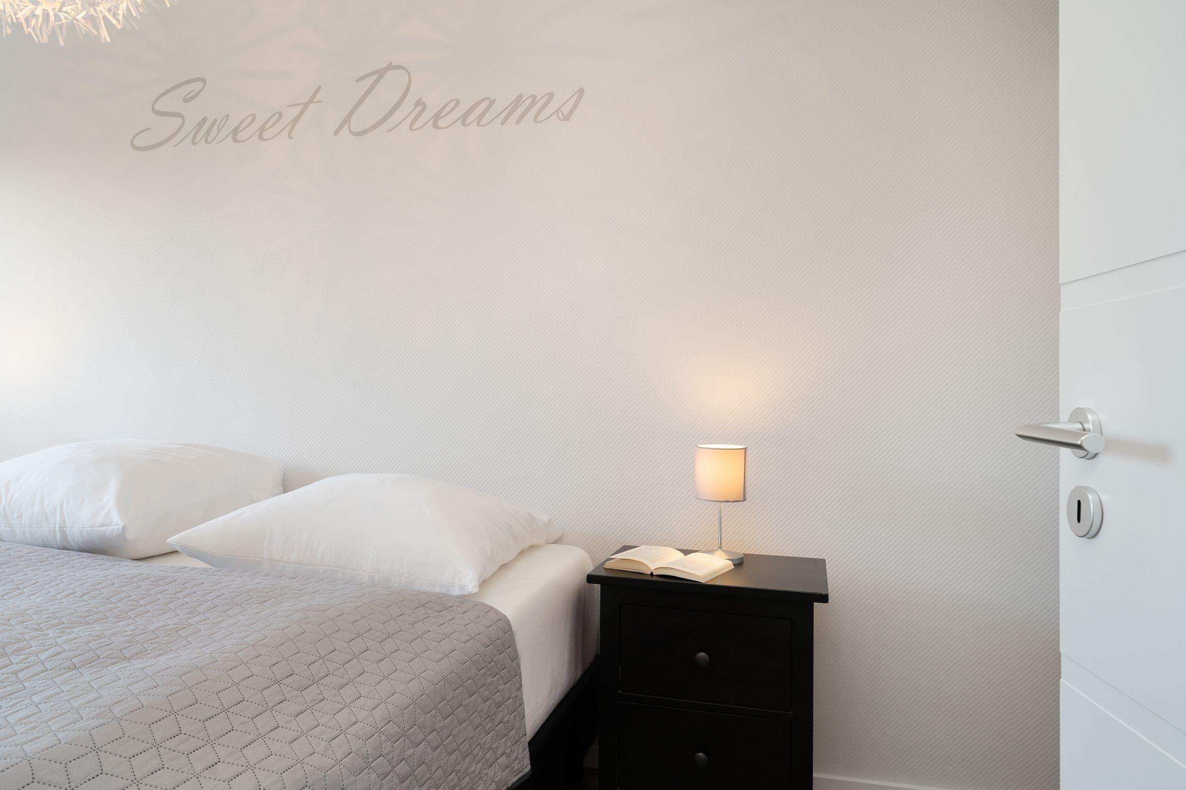 Diese stilvoll eingerichtete Ferienwohnung bietet einen offenen Wohnbereich mit gemütlicher Sitzecke, Sofa, TV und Radio für entspannte Stunden. Große Fenster sorgen für viel Tageslicht und einen schönen Ausblick auf die Ostsee. Der Balkon lädt mit Gartenmöbeln und Sonnenliegen dazu ein, die frische Seeluft zu genießen. Die Küche ist bestens ausgestattet mit Induktionsherd, Backofen, Spülmaschine, Kaffeemaschine, Wasserkocher und Toaster. Der angrenzende Essbereich bietet Platz für gemeinsame Mahlzeiten. Die Wohnung verfügt über zwei Schlafzimmer: In dem einen steht ein Doppelboxspringbett (2x 90x200cm), in dem anderen ein Doppelbett (2x 90x200cm). Ein Zimmer davon ist mit einer Wendeltreppe erreichbar und bietet eine weitere gemütliche Sitzecke mit TV und traumhaften Meerblick. In beiden Stockwerken befindet sich jeweils ein komfortables Duschbad.