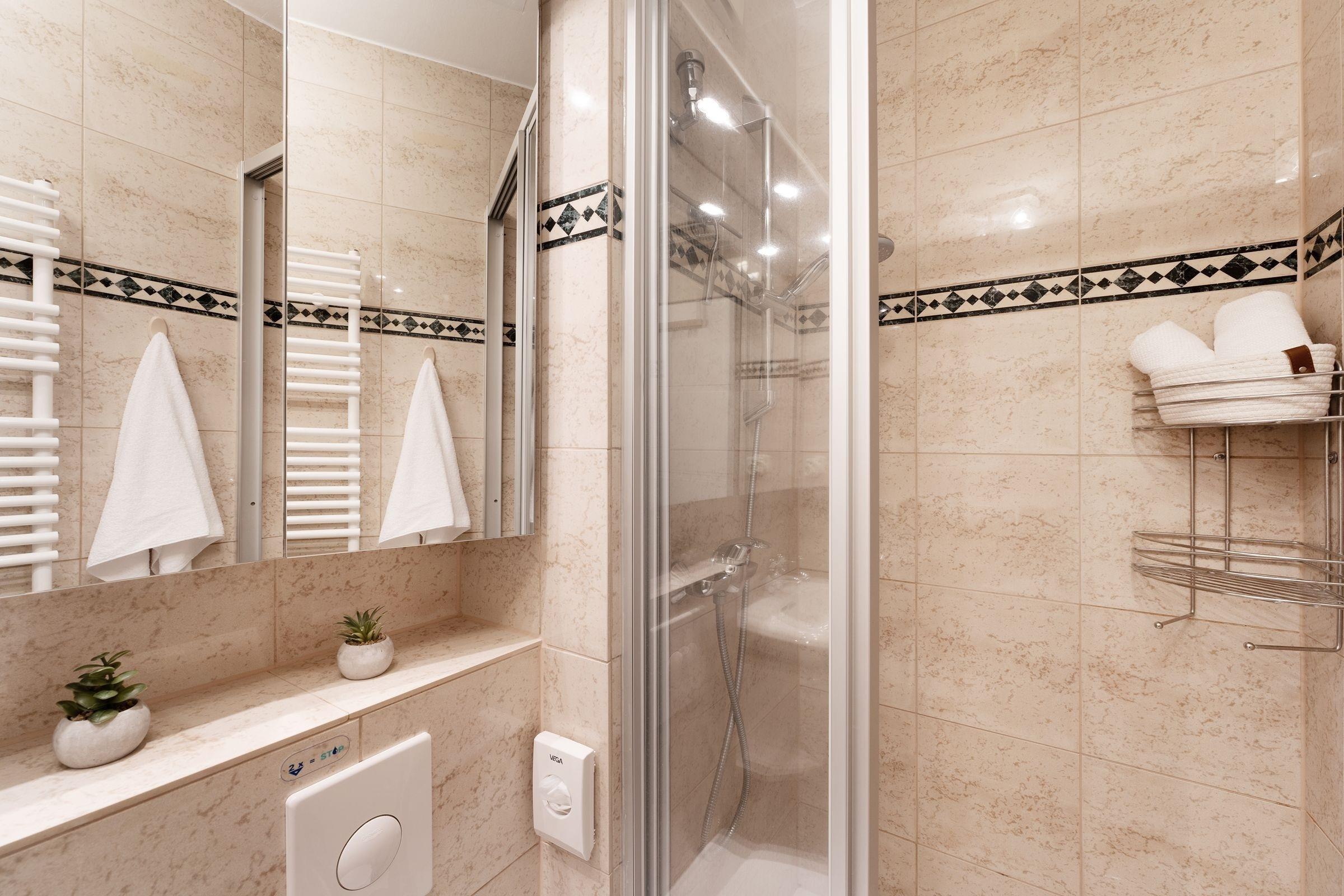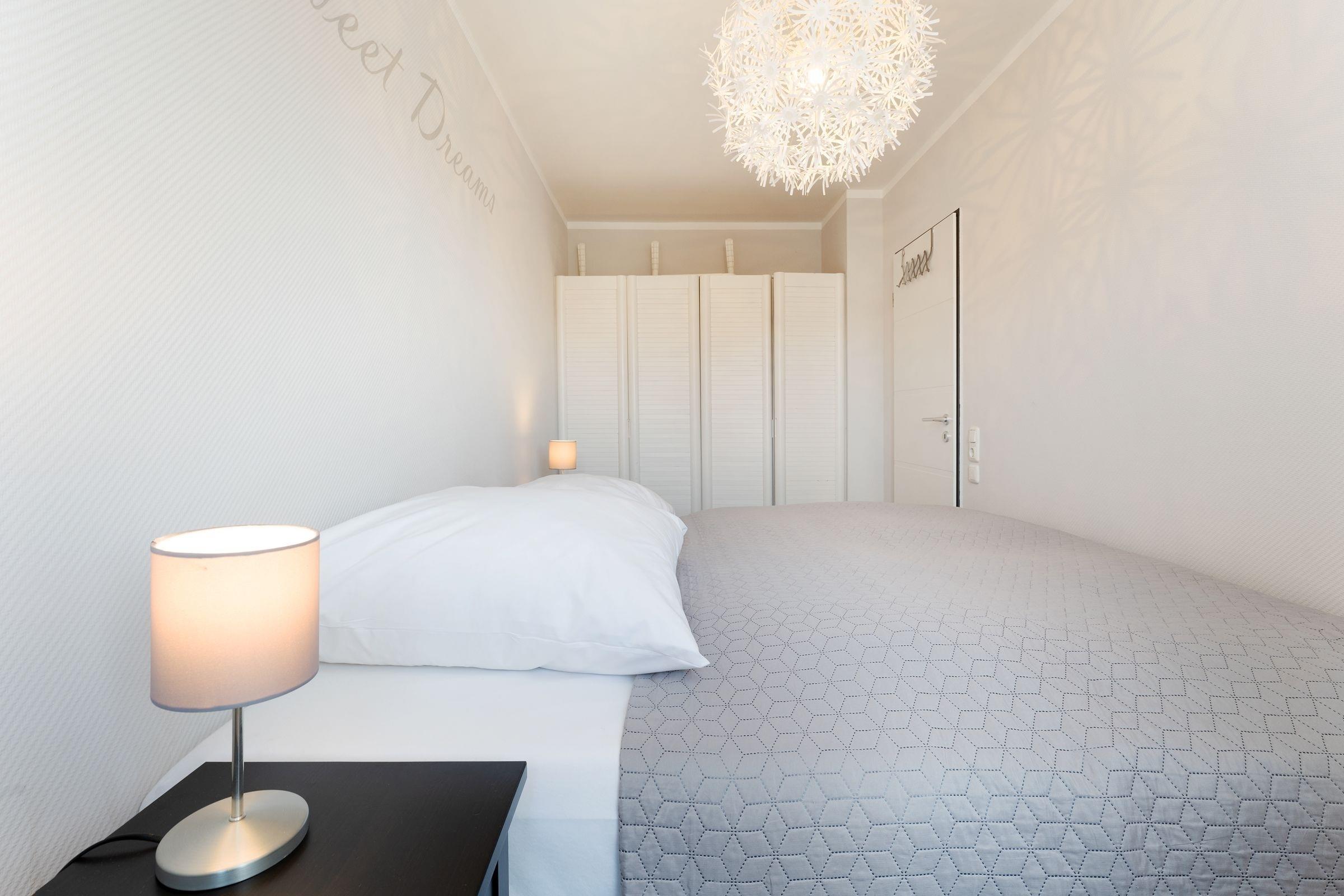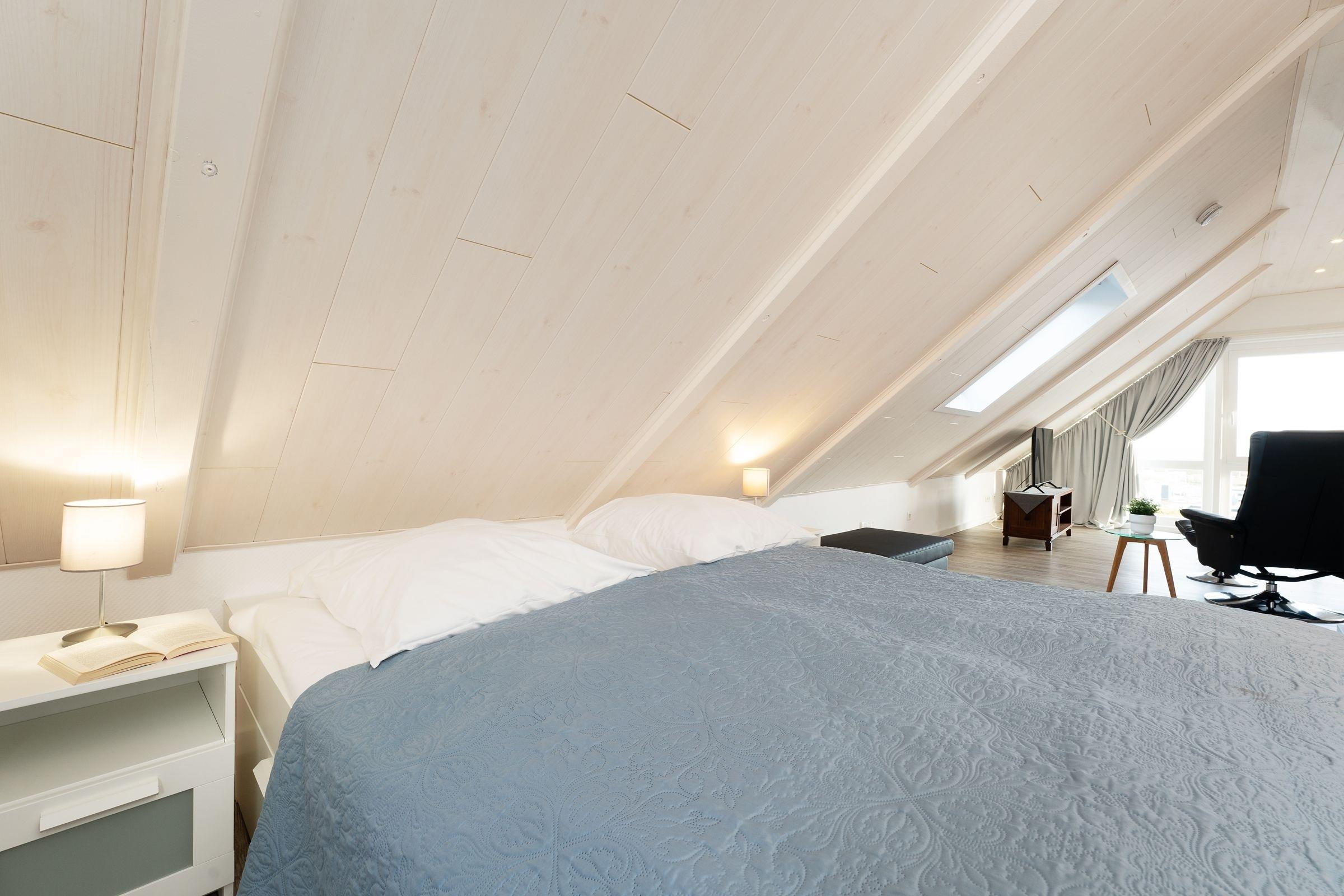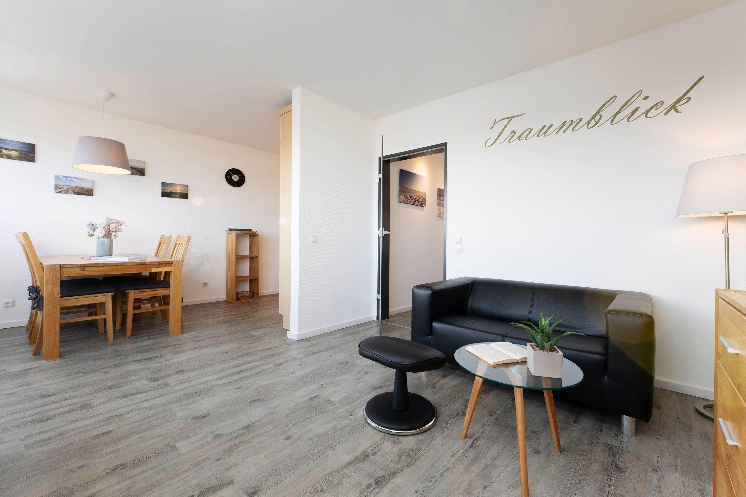 Diese stilvoll eingerichtete Ferienwohnung bietet einen offenen Wohnbereich mit gemütlicher Sitzecke, Sofa, TV und Radio für entspannte Stunden. Große Fenster sorgen für viel Tageslicht und einen schönen Ausblick auf die Ostsee. Der Balkon lädt mit Gartenmöbeln und Sonnenliegen dazu ein, die frische Seeluft zu genießen. Die Küche ist bestens ausgestattet mit Induktionsherd, Backofen, Spülmaschine, Kaffeemaschine, Wasserkocher und Toaster. Der angrenzende Essbereich bietet Platz für gemeinsame Mahlzeiten. Die Wohnung verfügt über zwei Schlafzimmer: In dem einen steht ein Doppelboxspringbett (2x 90x200cm), in dem anderen ein Doppelbett (2x 90x200cm). Ein Zimmer davon ist mit einer Wendeltreppe erreichbar und bietet eine weitere gemütliche Sitzecke mit TV und traumhaften Meerblick. In beiden Stockwerken befindet sich jeweils ein komfortables Duschbad.